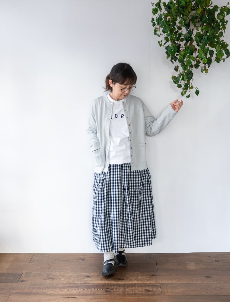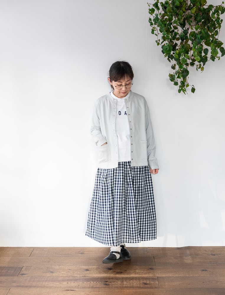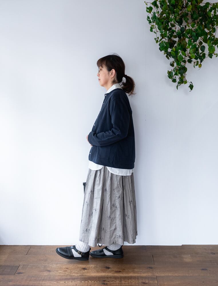 フリルブラウスやカットソーを覗かせたりと首元のコーディネートも楽しめます。ボタンをとめてプルオーバーようにも。