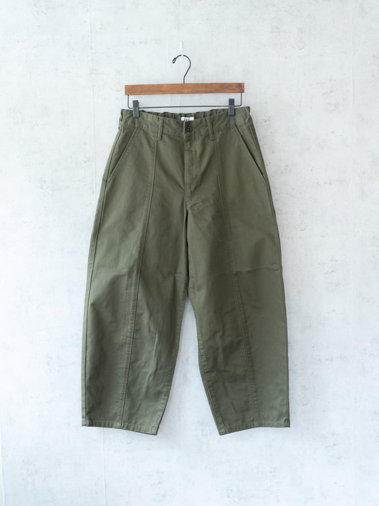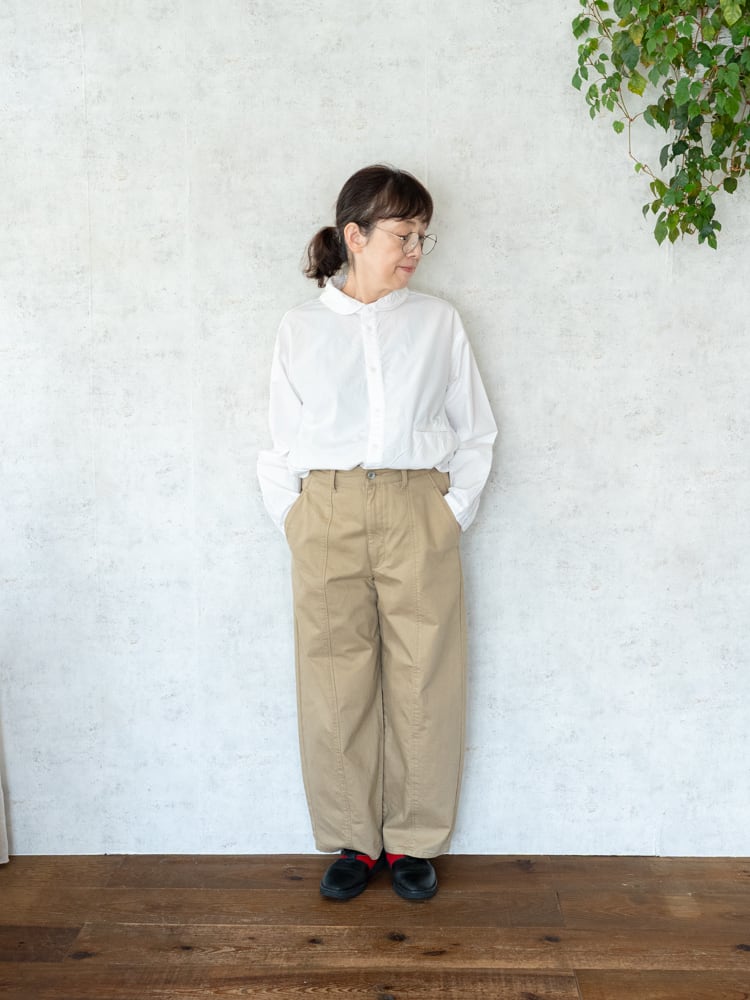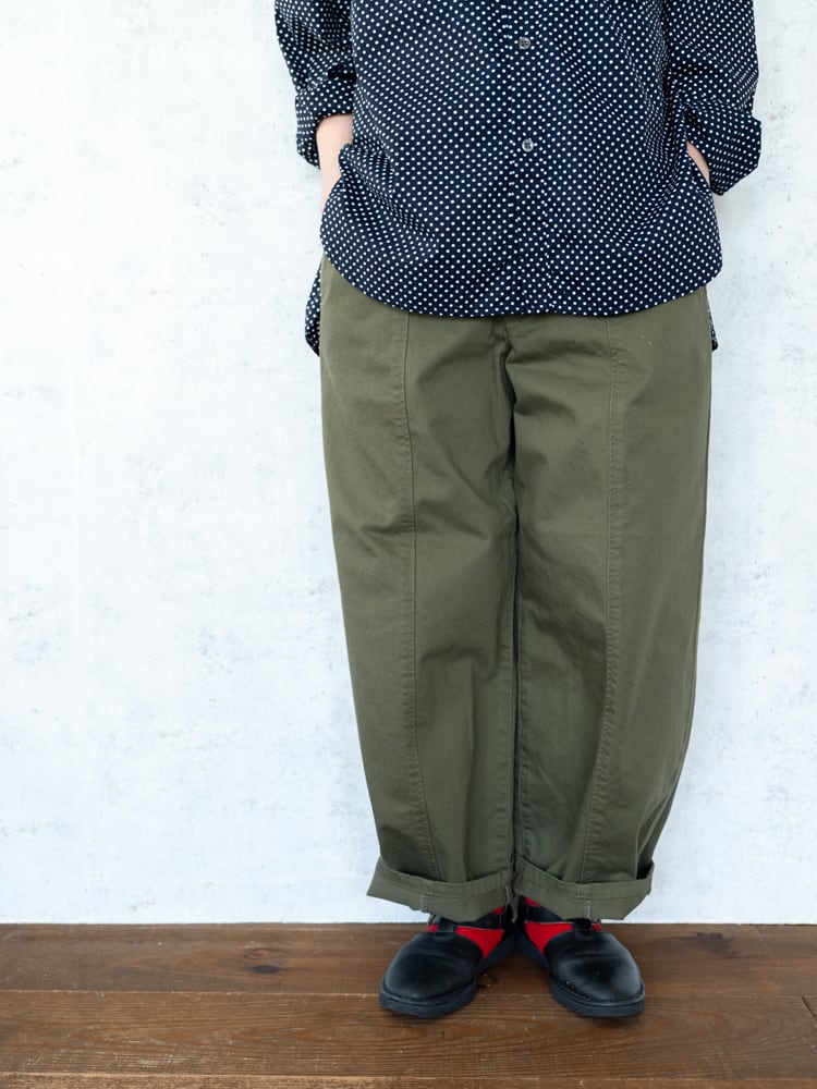 生地はフランス軍のチノパンのような雰囲気を再現したフレンチドリルを使用、程よい厚みでシーズンを問わず着回せるアイテムになっています。