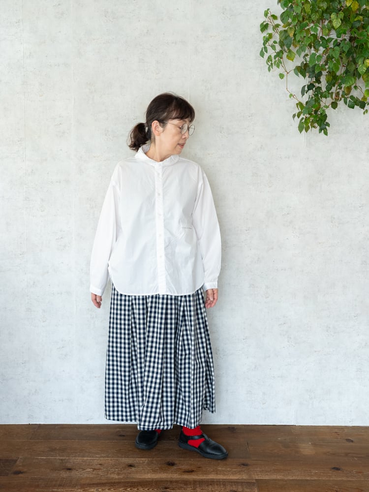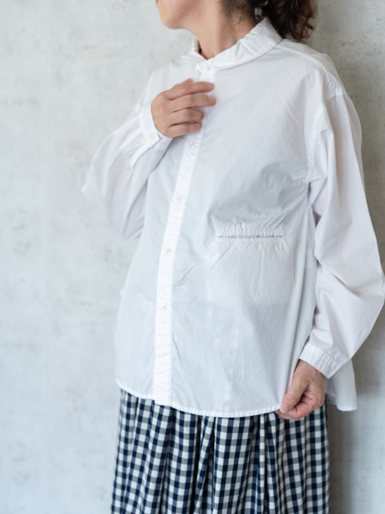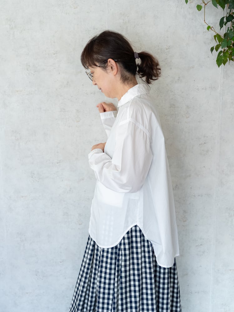 適度なハリ感があり滑るような肌触りの上質なタイプライター生地を使用。肌に触れるととても心地良い素材で風通しも良いので季節の変わり目にかけて長く着回せます。