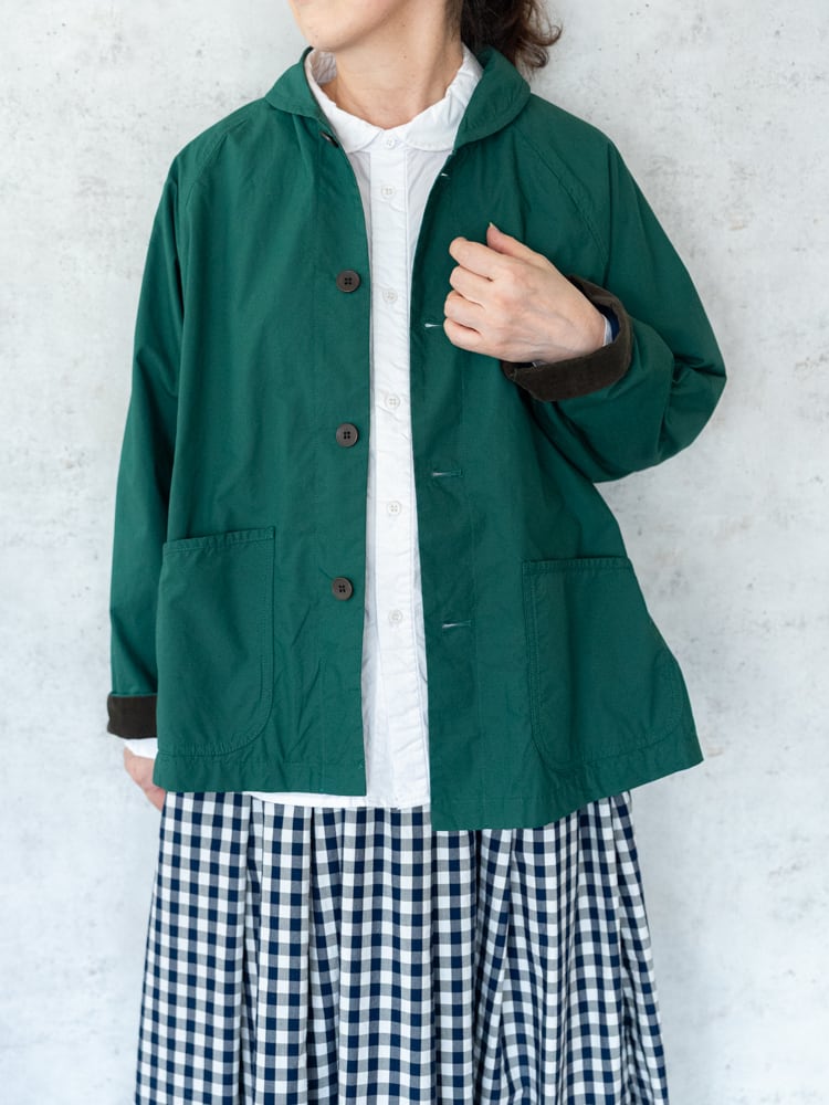 小さく丸みのある丸襟にチンストラップ付きのデザイン。胸下のポケット、バックの大きなタックもポイントです。