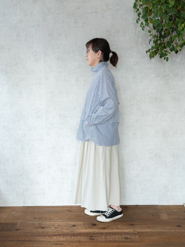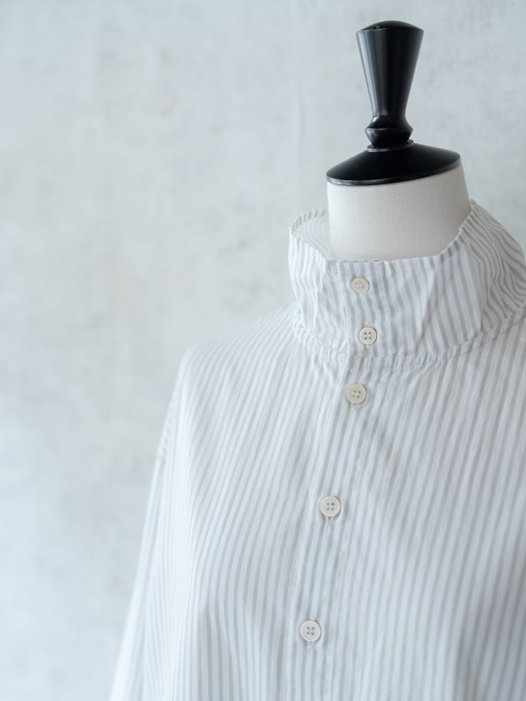 grin定番のブロードシャツ生地を使ったハイネックのデザインが特徴的なブラウス。