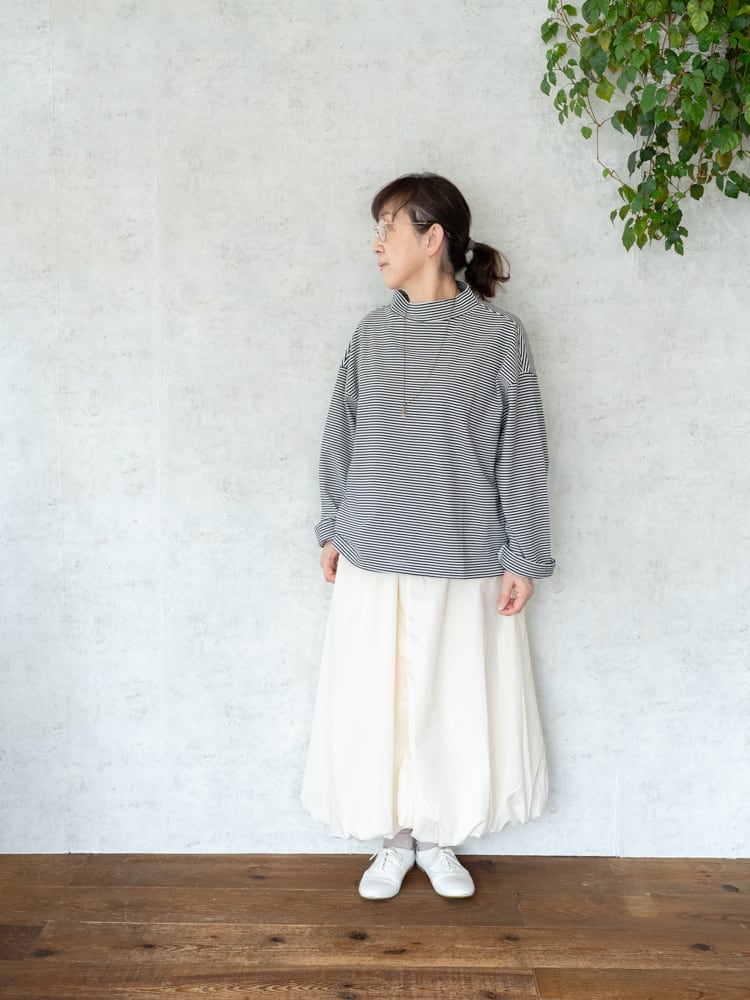 カジュアルにも甘めにも何にでも合わせやすくいろんな着こなしに映えるボーダーはこれからの季節にぴったりな一枚。