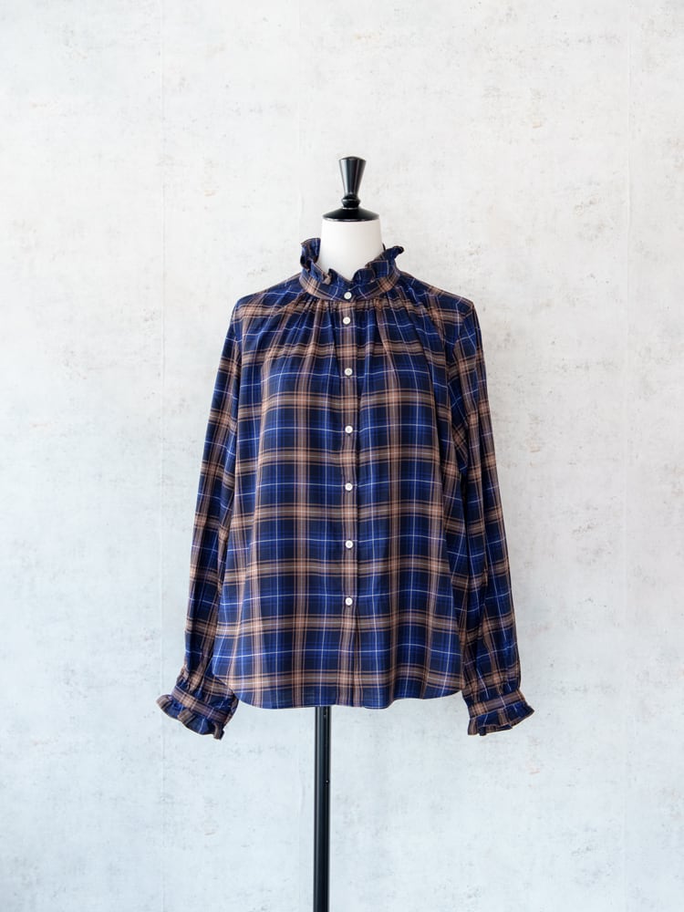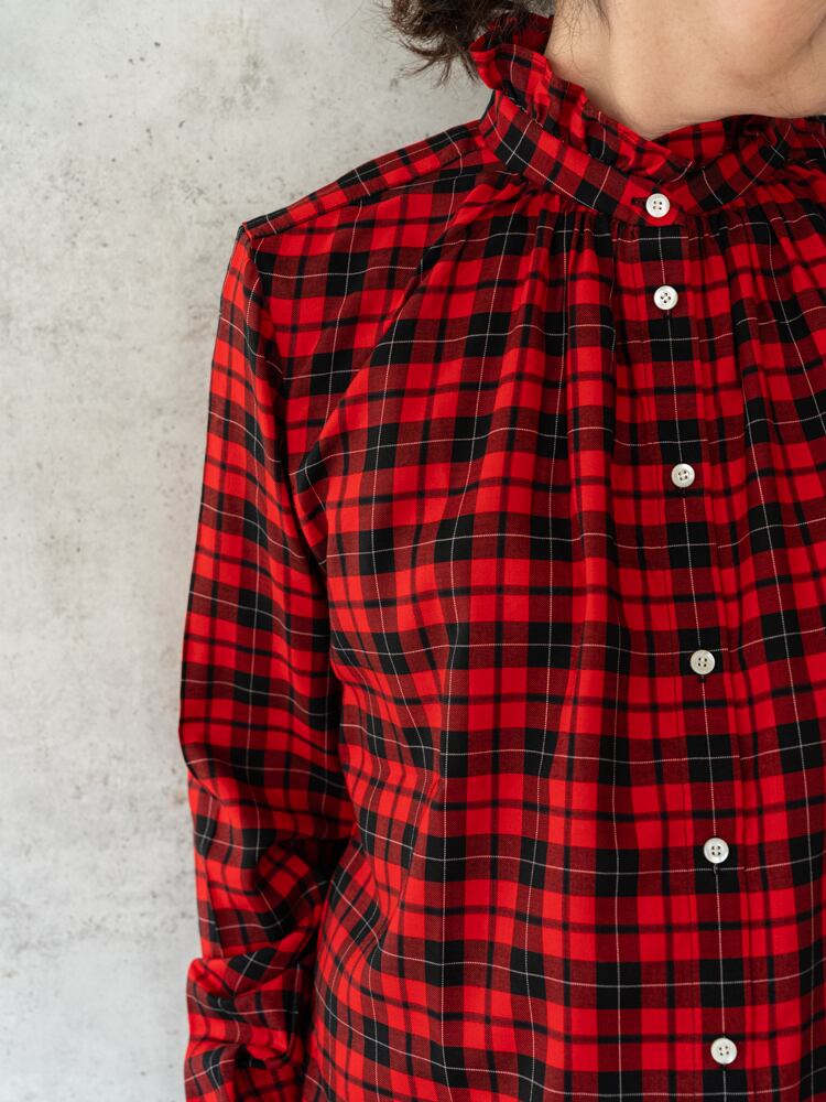 顔周りを華やかに演出する襟元と袖のフリル印象的なベーシックなチェック柄を使ったブラウス。