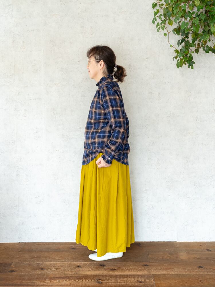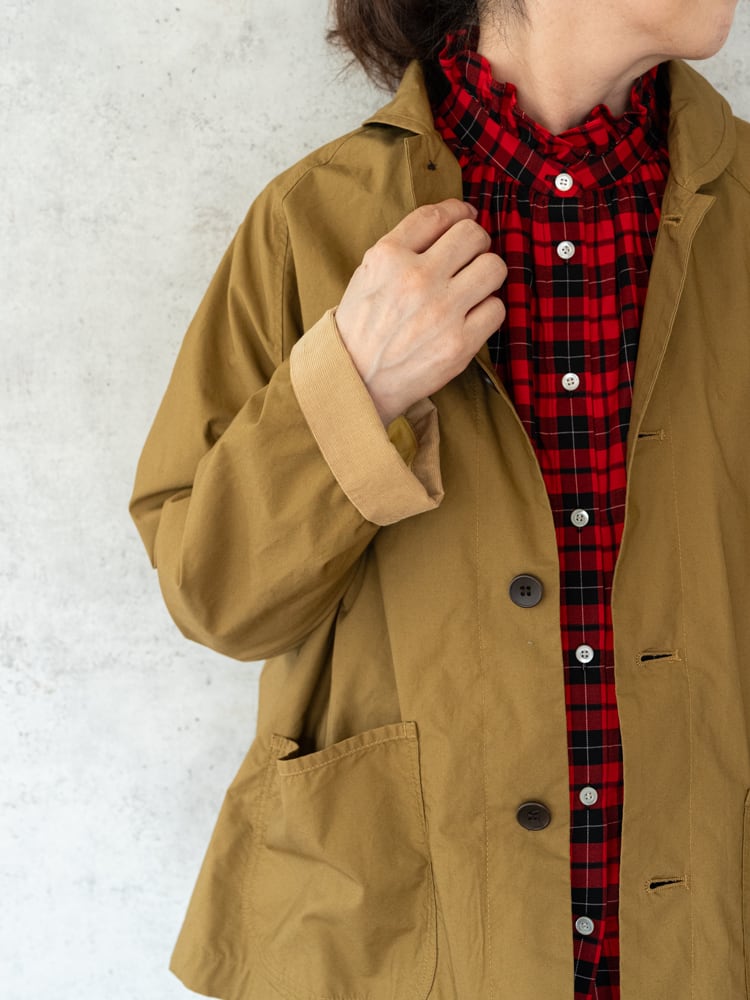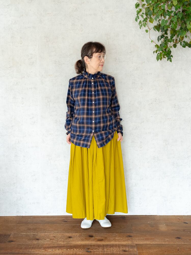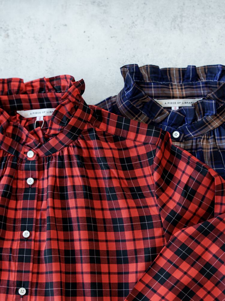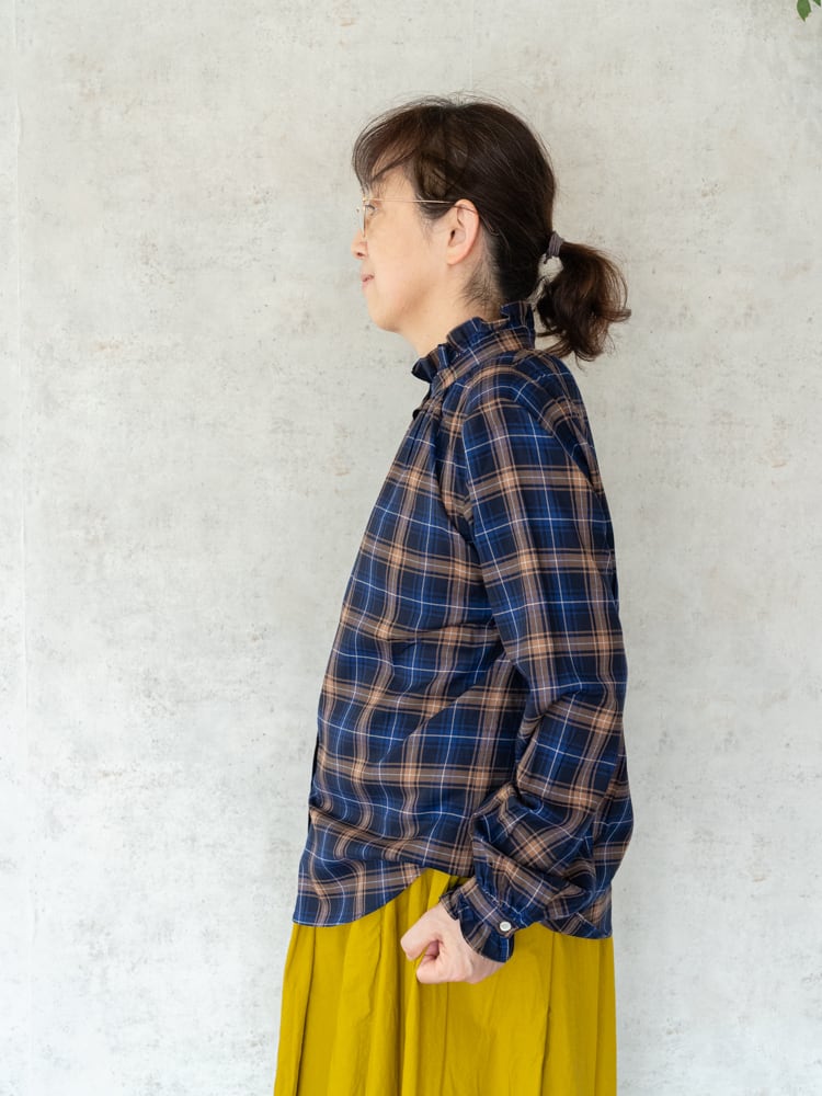 首元や袖口にフリルがあることで華やかさが生まれ、お顔周りをフワっと華やかに魅せてくれます。秋らしいタータンチェックの配色は、日々の着こなしにも使いやすいベーシックな色合い。