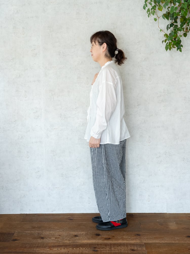 ウエストはゴム紐仕様でリラックス感のある穿き心地の良さ、タックが入ることによって収まりの良いウエストラインに。