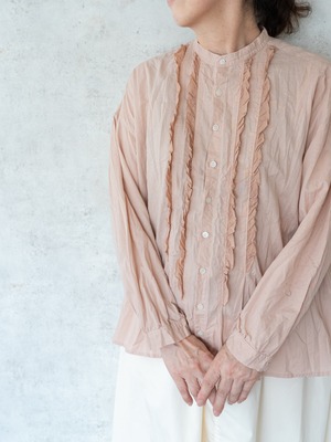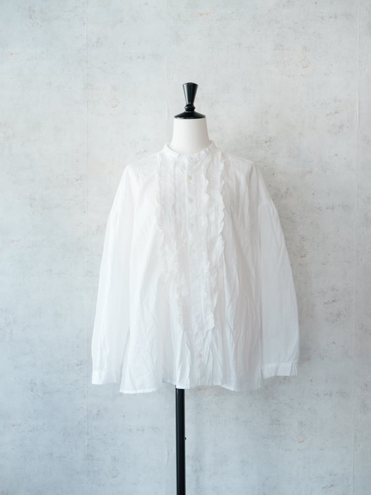 すっきりとしたスタンドカラーに目を引く胸元のフリル使い、ほんのりふわっとした袖が魅力のシャツ。