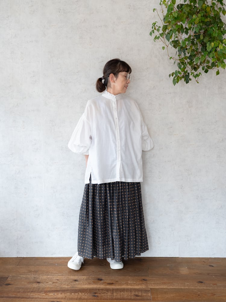 柔らかな肌触りが特徴のコットンボイル生地にハンドスクリーンにてオリジナルのプリント柄を散りばめたスカート。