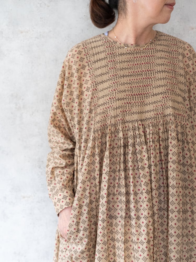 柔らかな肌触りが特徴のコットンボイル生地にハンドスクリーンにて花柄プリントが散りばめられたワンピース。