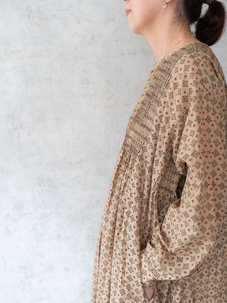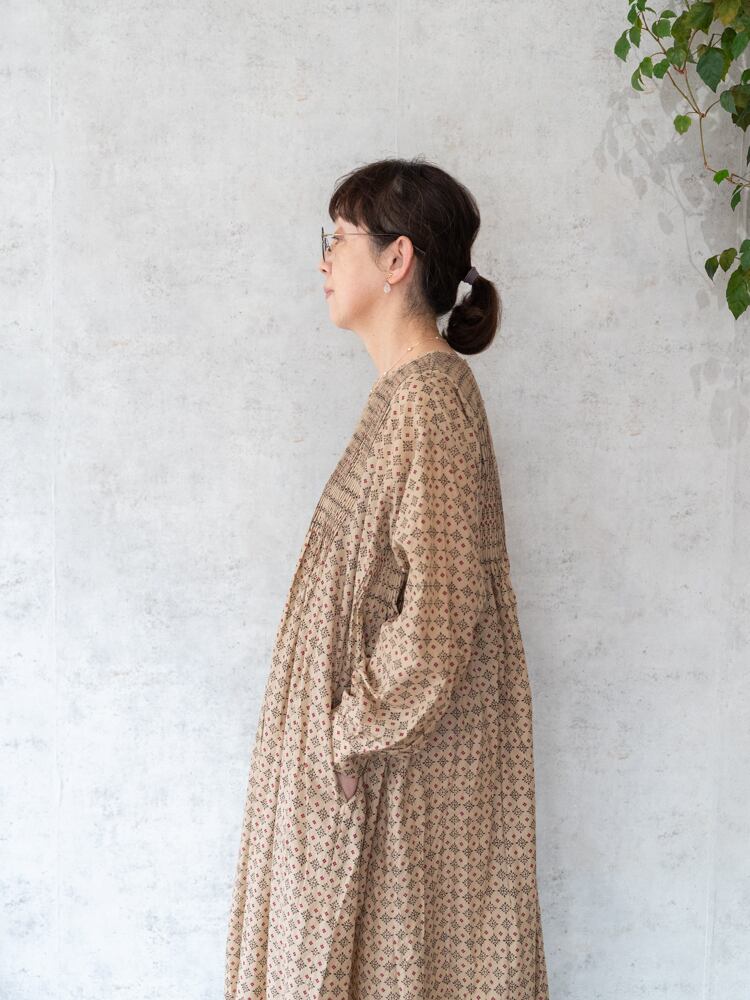 背前後身頃の中央部分や、サイドに細やかなピンタックを施し、ふんわりしたシルエットや素材の膨らみ感を際立たせたデザインが特徴のワンピース。ドロップショルダーやゆとりのある身幅で、リラックスした着心地も魅力です。