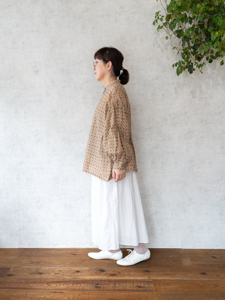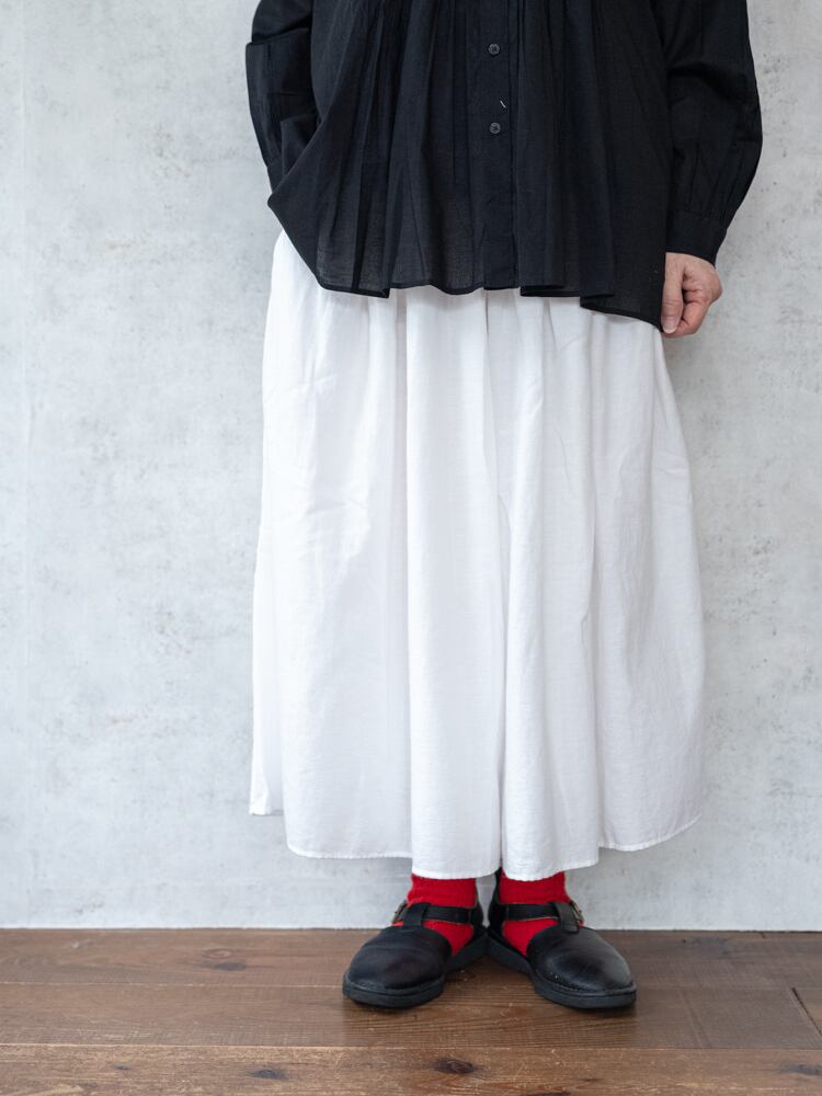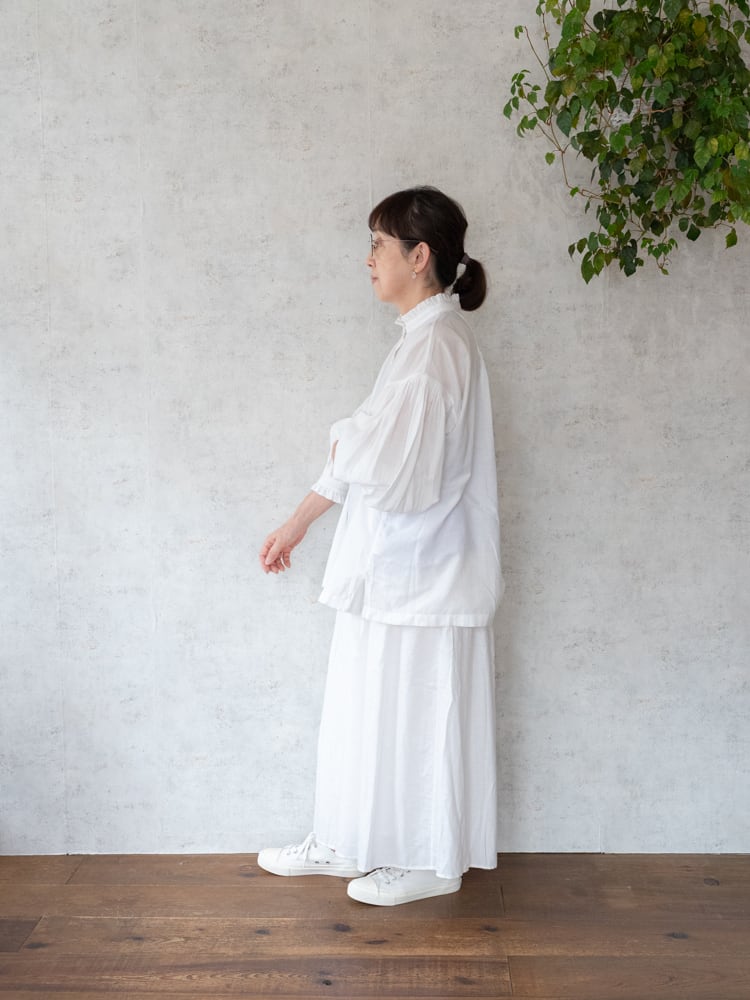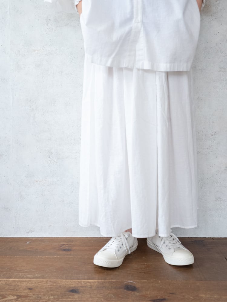 ウエストはゴムと紐のイージー仕様で、締め付けがなくリラックスした履き心地の一枚。たっぷり入った細やかなギャザーが程よく広がり、スカート見えするパンツです。
