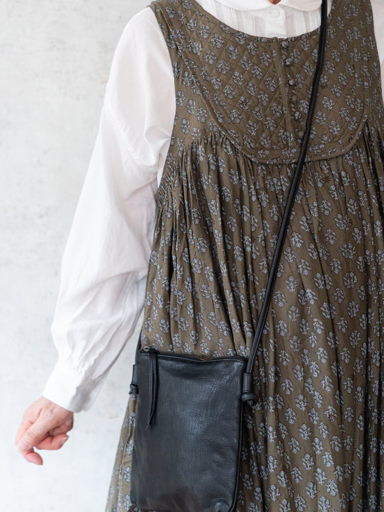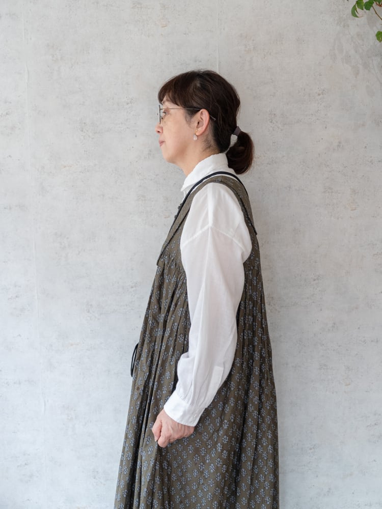 切り替え位置にはラジャスタンタックギャザー(インド北西部のラジャスタン地方に伝わる細かいタックとギャザー使い)を施すことで、ふんわりと柔らかなシルエットに仕上がり、どこかクラシカルで女性らしい雰囲気を演出します。