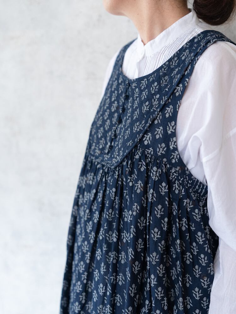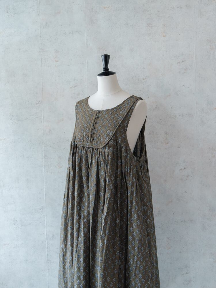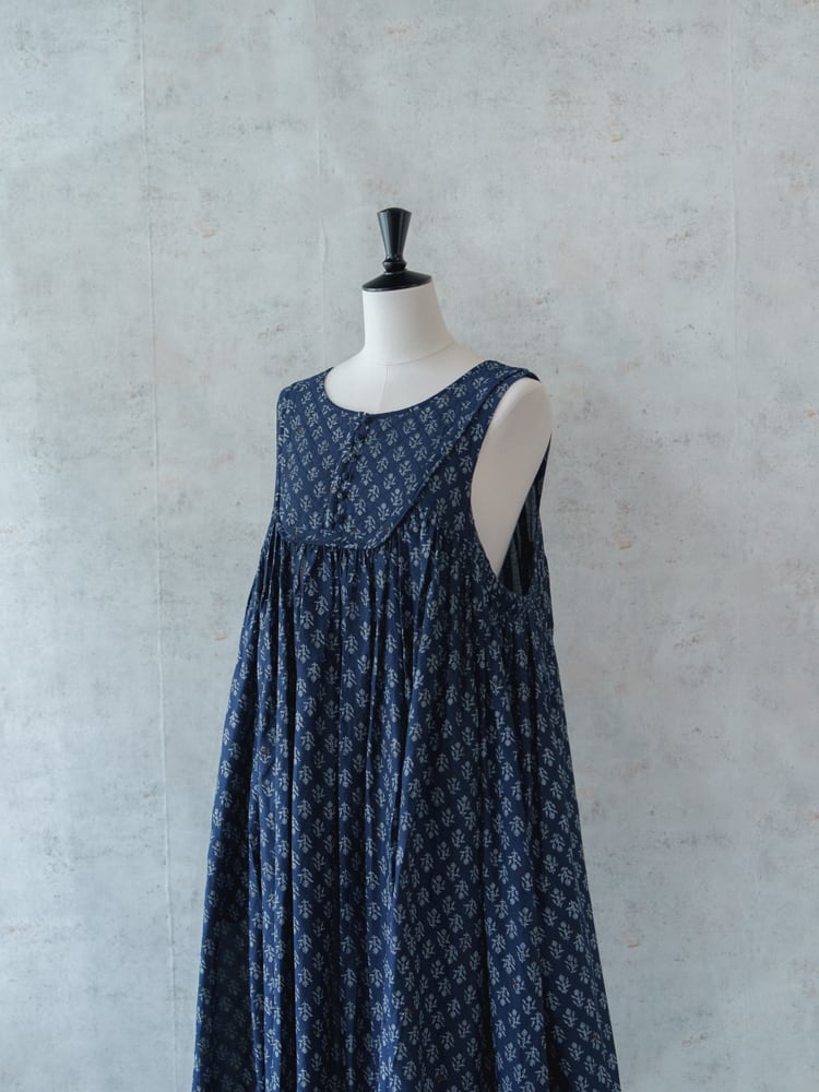 オーガニックコットン生地にインドの伝統技法"ブロックプリント"の花をモチーフにしたプリントを施したノースリーブワンピース。