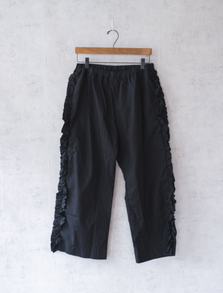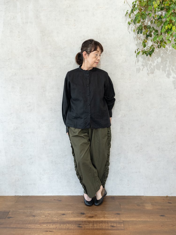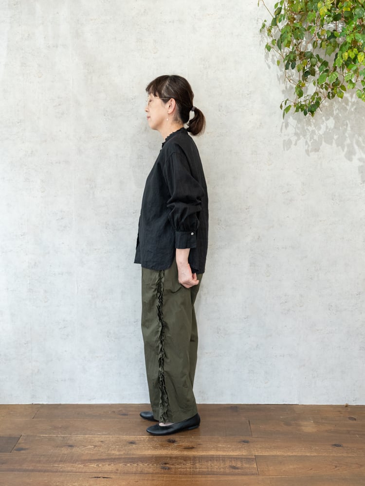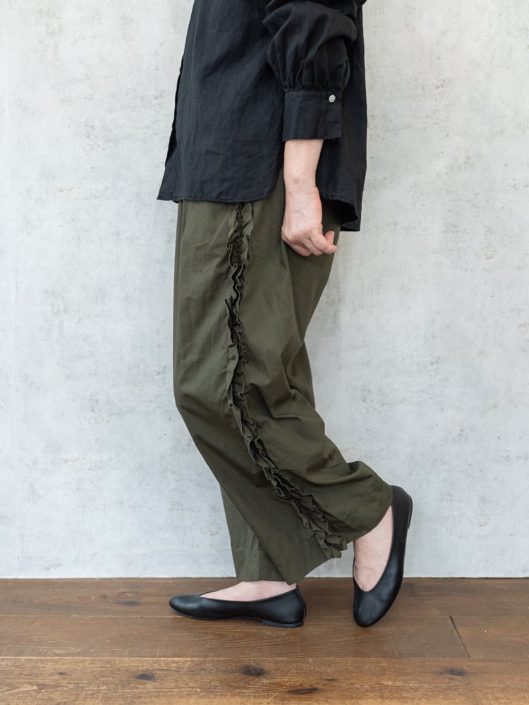 甘くなりがちなフリルも太過ぎないプレーンなシルエットとカジュアルめな素材感で合わせやすく普段のコーディネートに取り入れやすいガーゼらしいパンツになっています。
