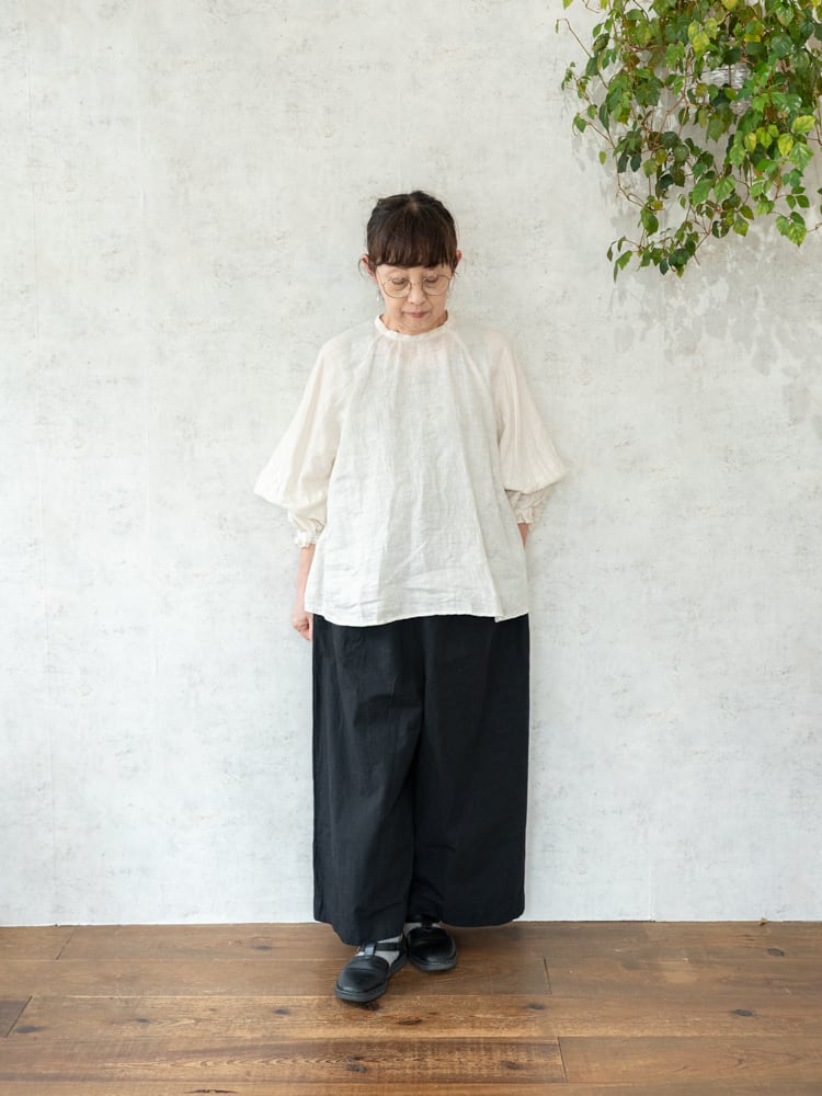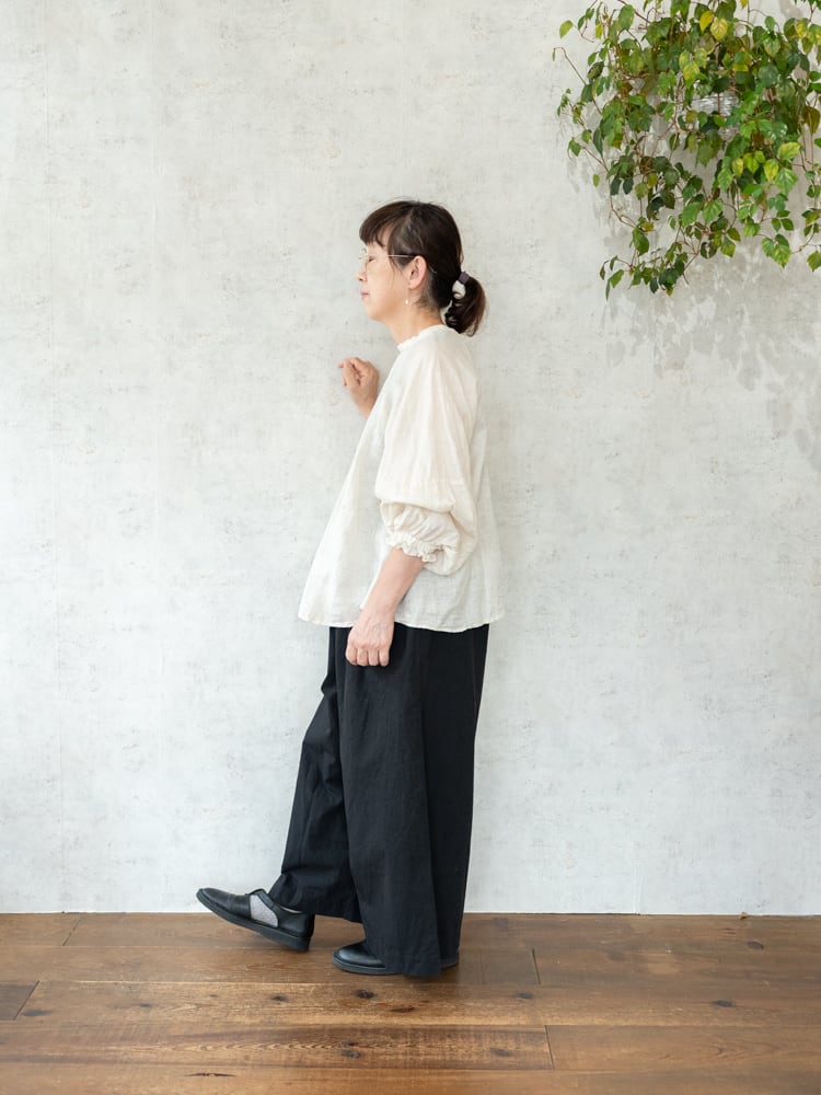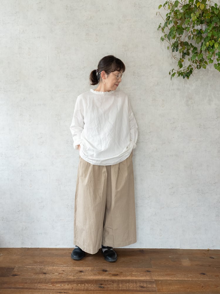 股上をしっかりと取ったゆったりシルエットで素材もハリがあり普通はボリュームが出過ぎるのですが穿くとストンとコーディネートに馴染むシルエットがガーゼのパンツらしい一枚です。