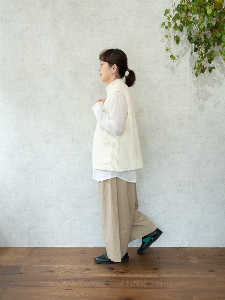 ポコポコとした素材感が可愛く一枚羽織るだけで秋冬らしさが演出できるアイテムでウールのニットが苦手な方にもオススメしたいベストです。