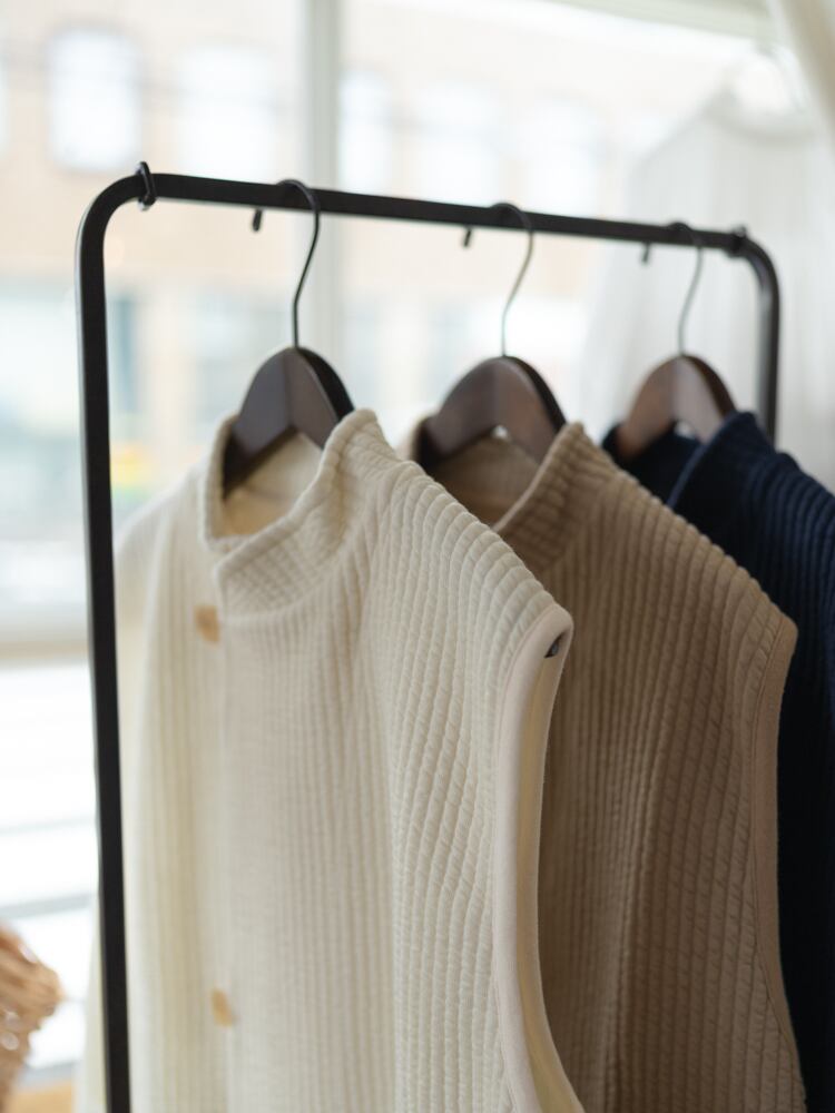 伸縮性のいいコットン素材のキルトはとても軽く気持ちのいい着心地でデイリーに着たくなるスタンドカラーのベスト。