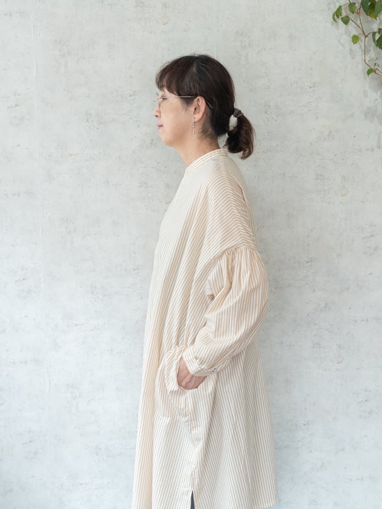 新色のベージュストライプを加えたベーシックなカラーは合わせるアイテム、季節を問わず一枚あると重宝するアイテムになってくれます。