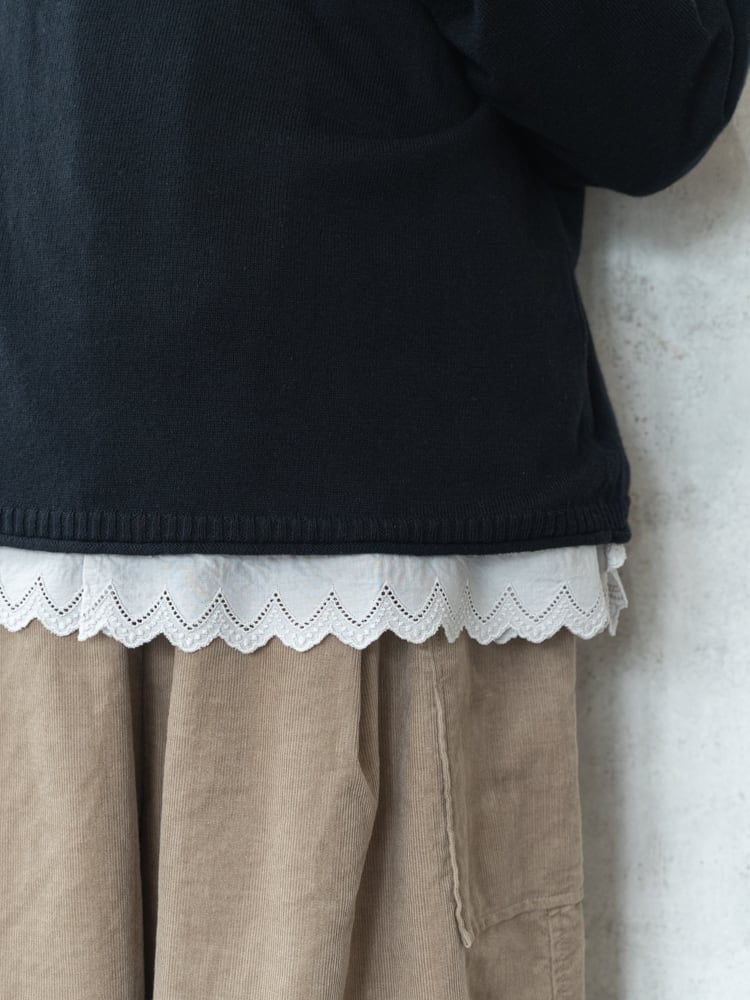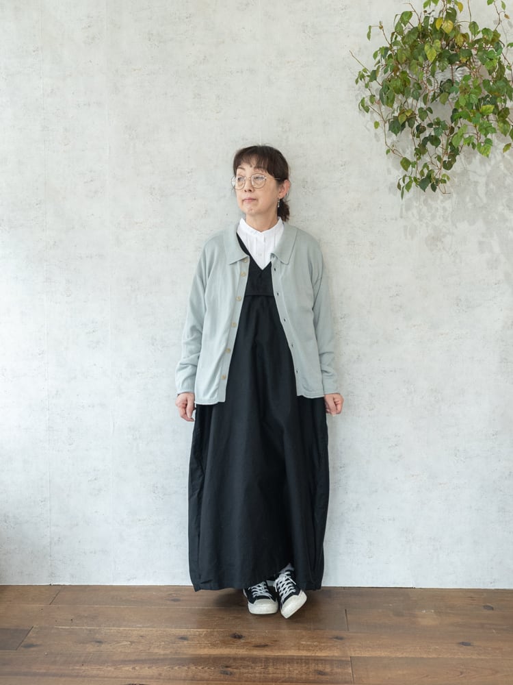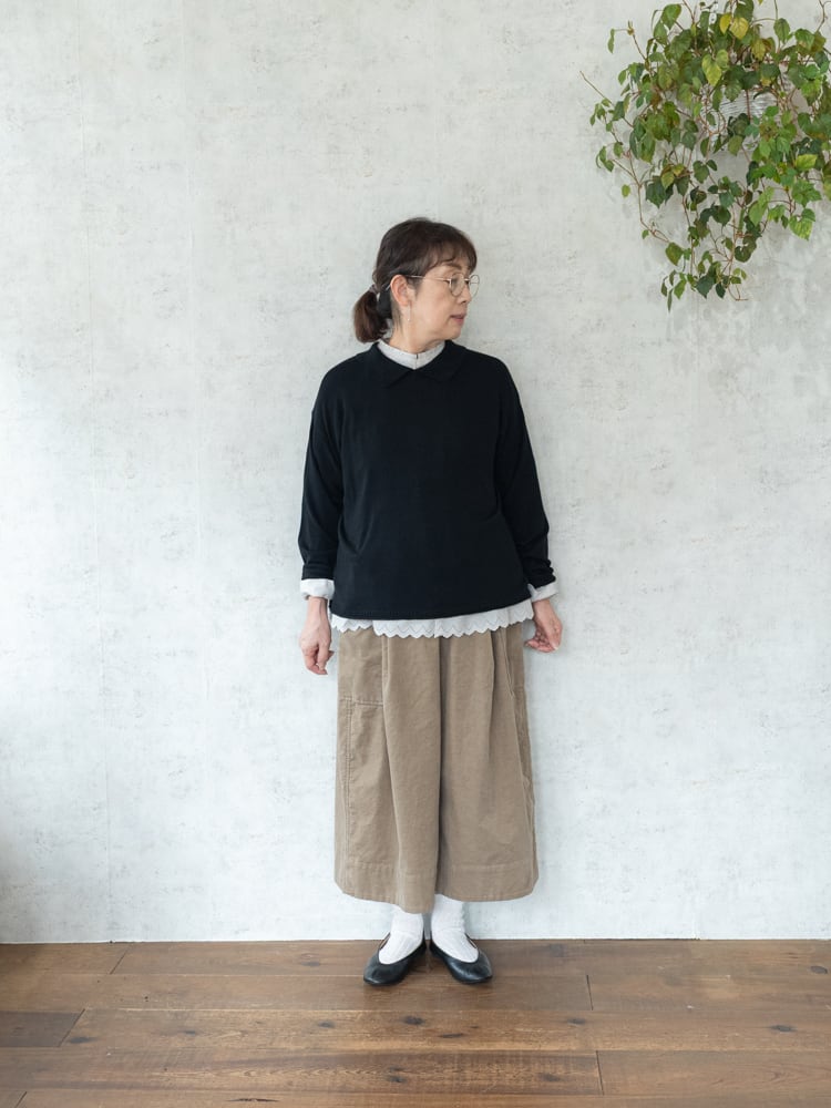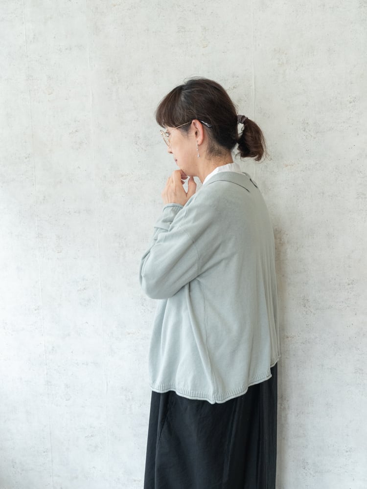 素材のコットンカシミアはカシミアの滑らかな風合いを感じさせつつもコットンの混率が高いので取り扱いも簡単でデイリーに着やすくなっています。