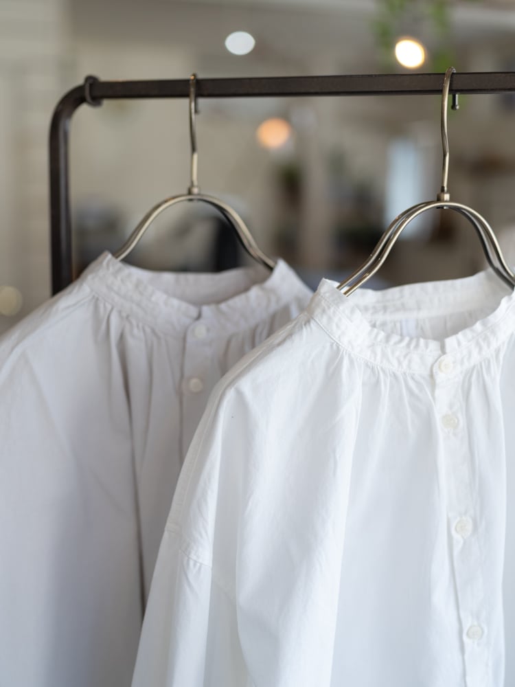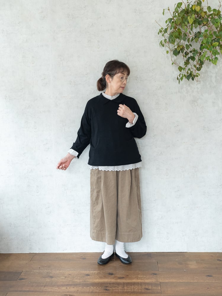 全体的にゆったりとしたデザインで襟周りや袖にもギャザーを寄せた柔らかな雰囲気が女性らしい仕上がりになっています。