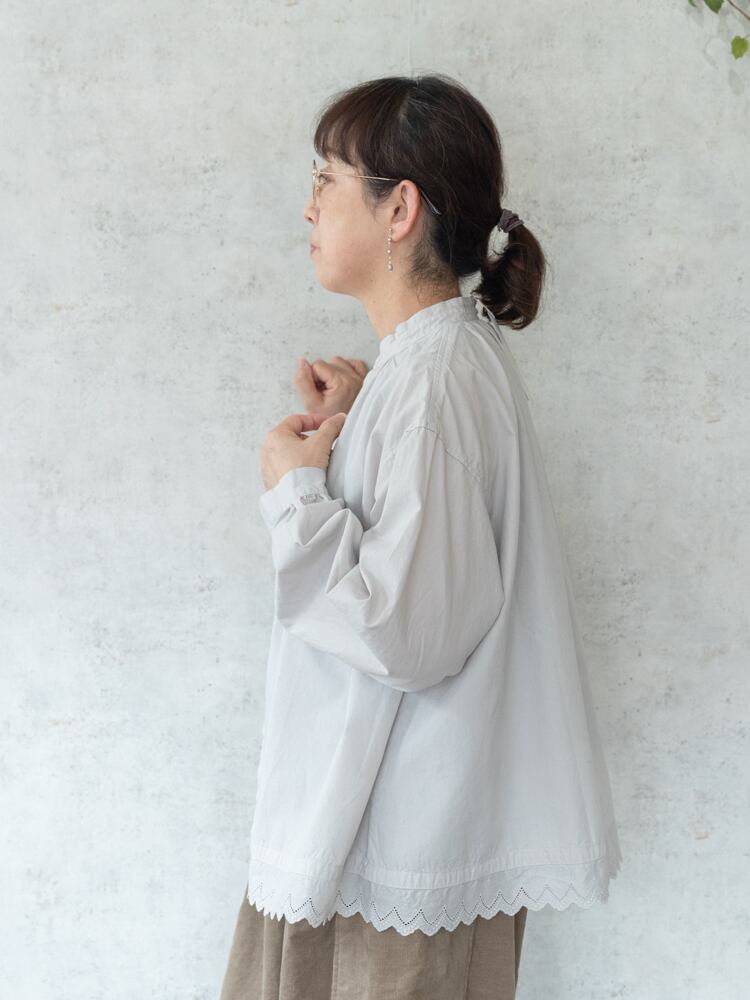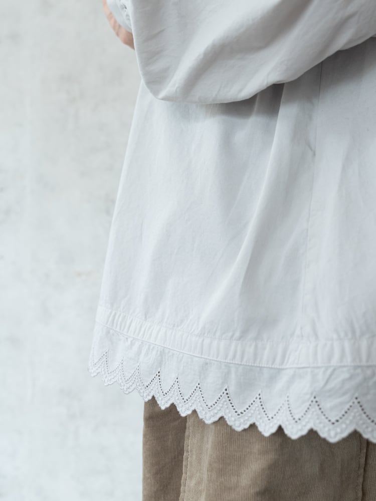 透けにくく程よいハリ感のあるブロード素材を使った裾のレース使いが可愛いスタンドカラーブラウス。