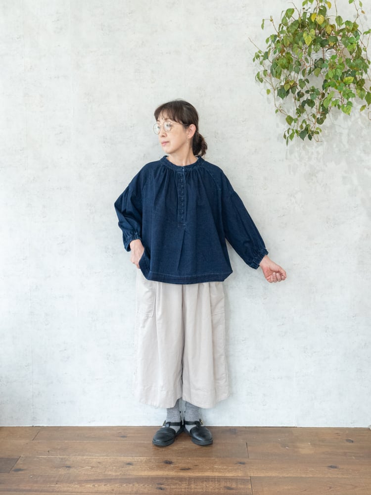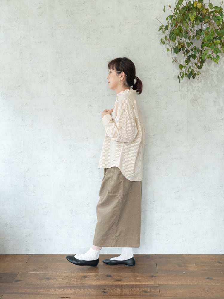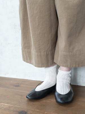 くるぶしが覗く短めの着丈でシューズやソックスとの組み合わせも楽しくなるパンツです。