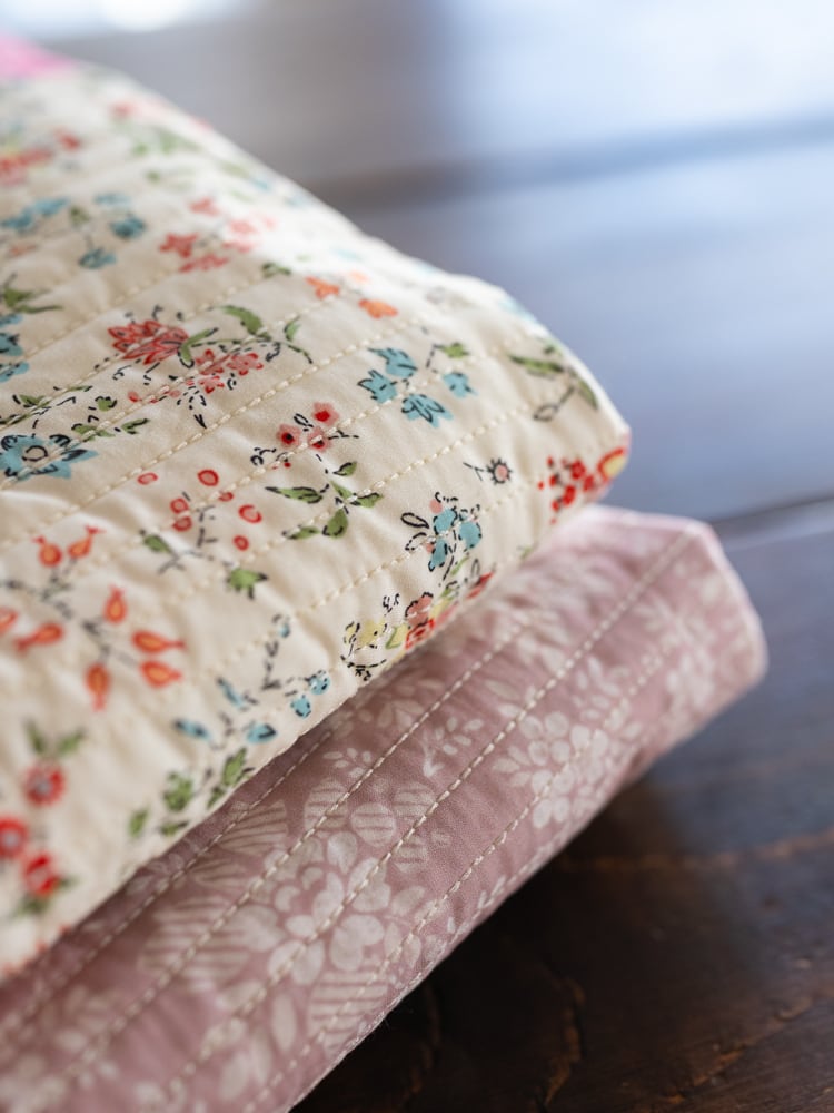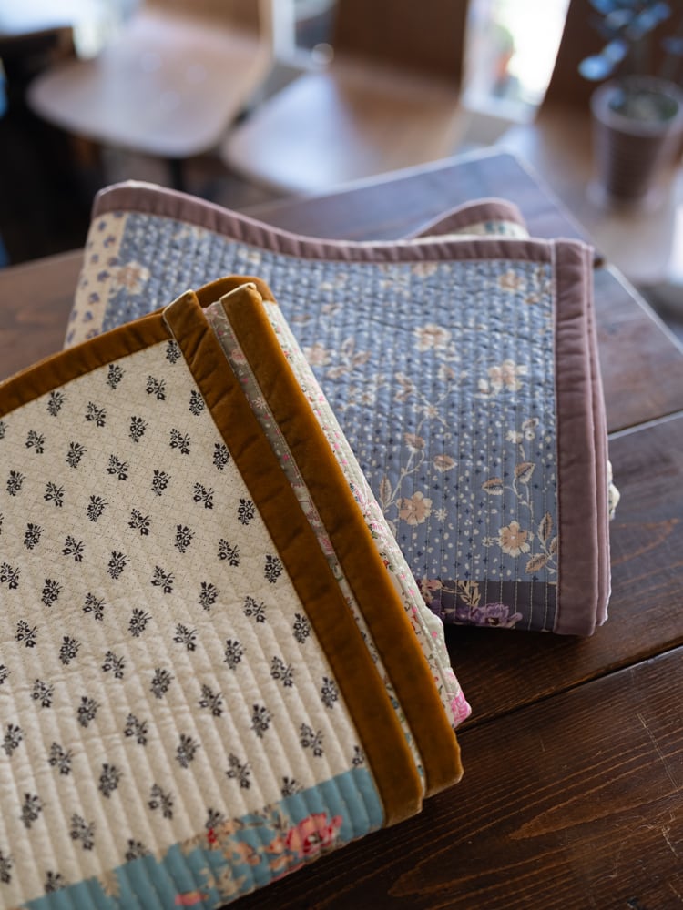 パッチワーク風にさまざまな柄を組み合わせ、柄の配置や色づけにもこだわったオリジナルプリント。光沢のあるベルベットテープで縁取ることで、あたたかさの中に大人のアクセントを添えました。