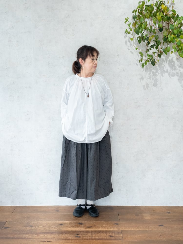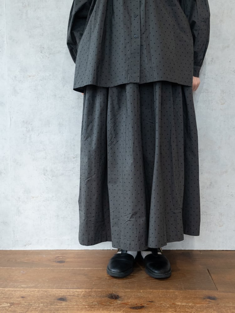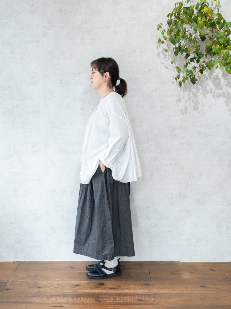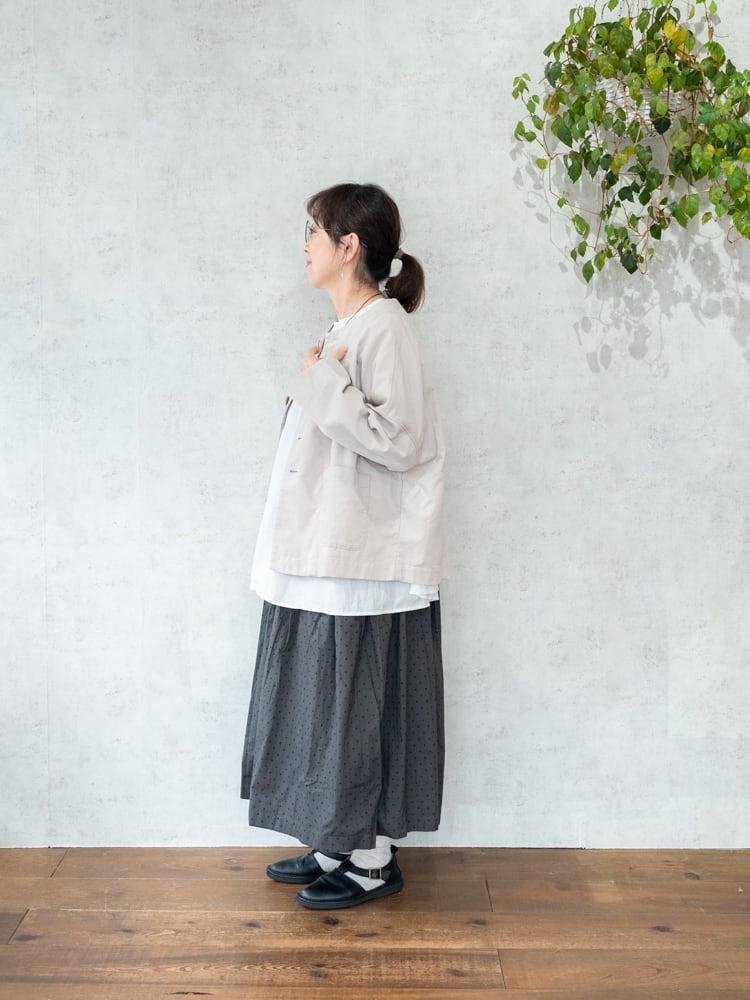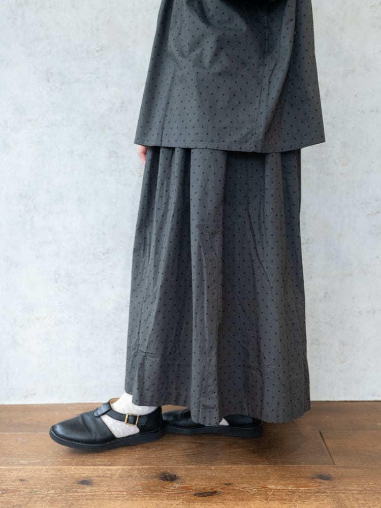 ポップな印象になりがちなドット柄ですが、コントラストを抑えた配色で大人も取り入れやすいアイテムに仕上がっています。