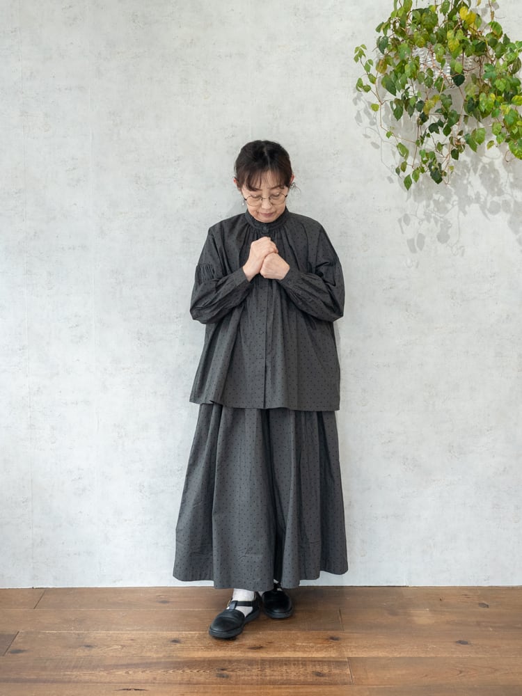 首元とドロップショルダーから広がるギャザーが、女性らしさを引き立て、身幅の広いデザインでゆったりとした着心地も魅力です。