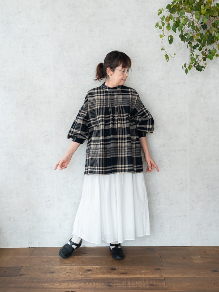 前後の首元や袖部分に施したピンタックによりふんわりとゆとりのあるシルエットでリラックス感のある着心地のブラウス。