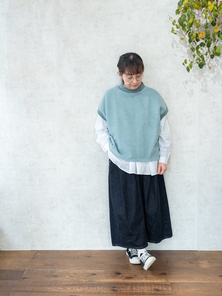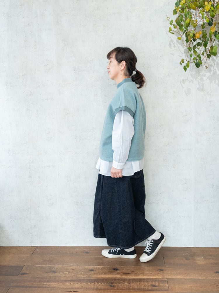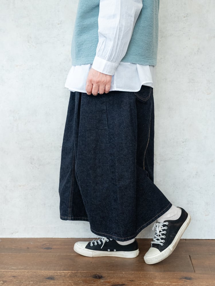 Brocanteが得意とするコクーンシルエットと大きな1本タックがポイントのアンプリッセシリーズにデニムスカートが加わりました。