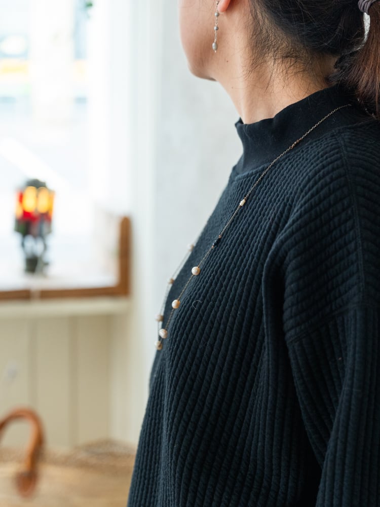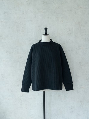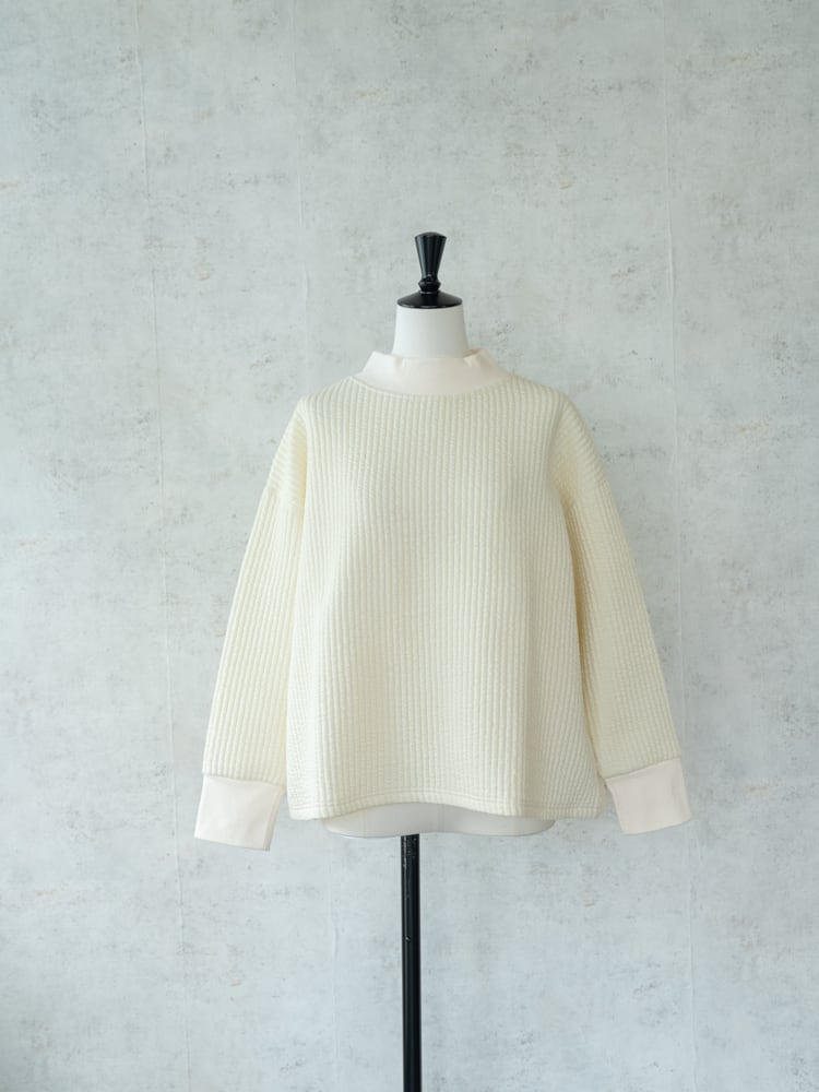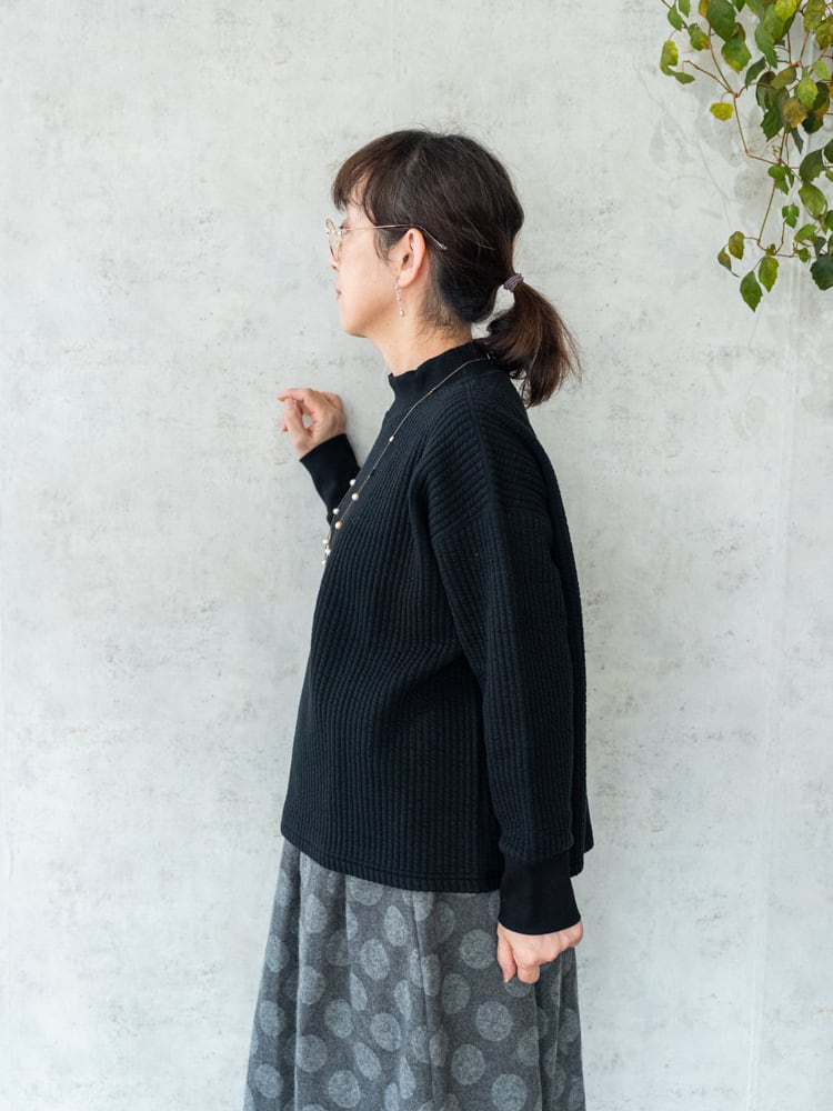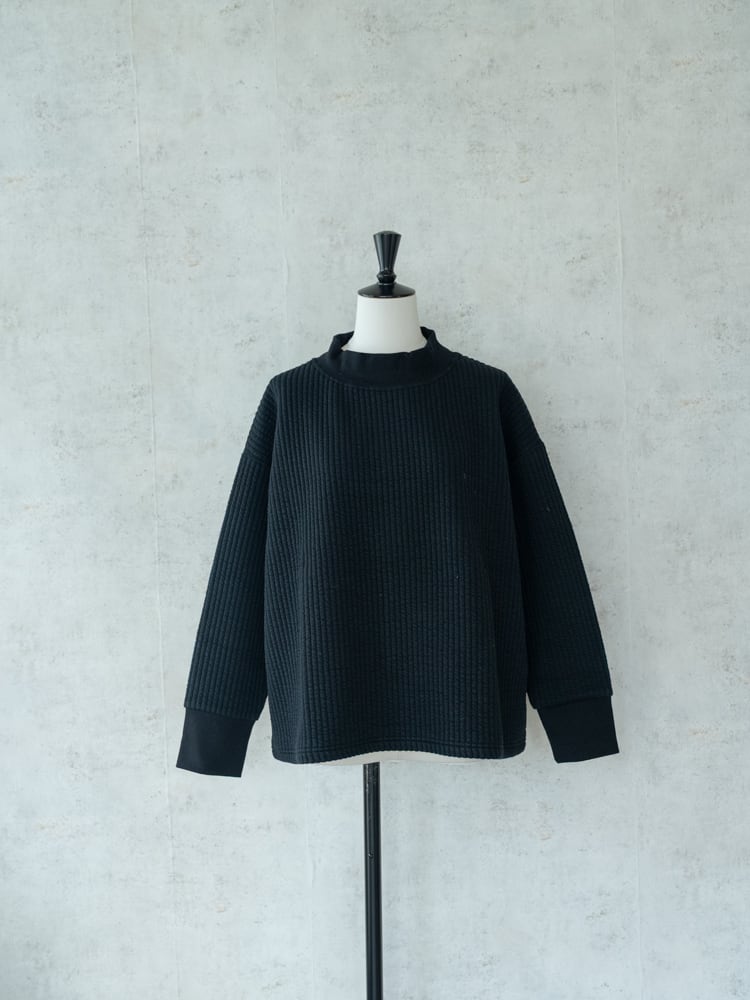 伸縮性のいいコットン素材のキルトはとても軽く気持ちのいい着心地でデイリーに着たくなるモックネックのプルオーバー。