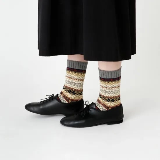 雪の結晶や落ち葉をイメージした、ノルディックな雰囲気が魅力のソックスです。