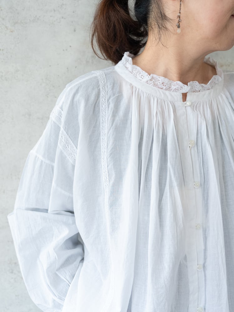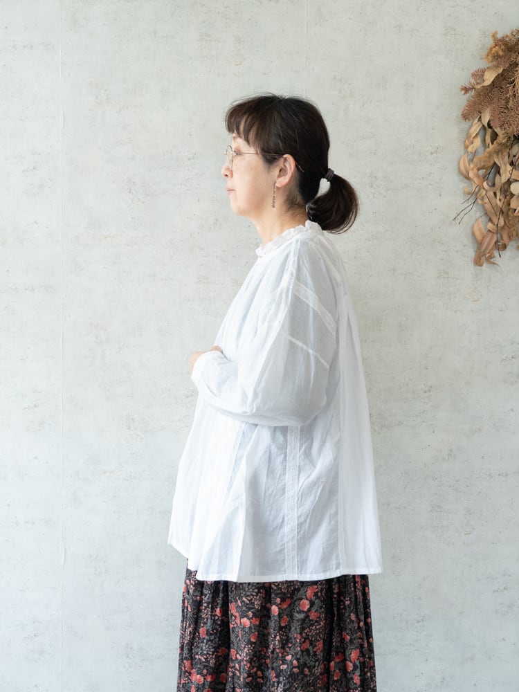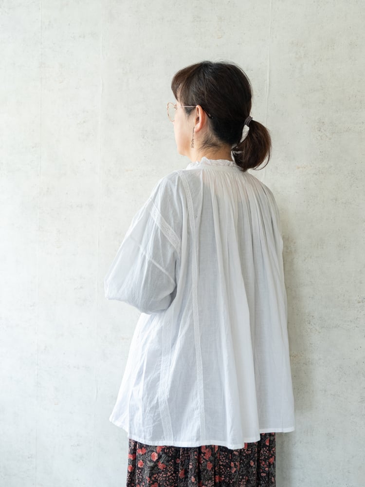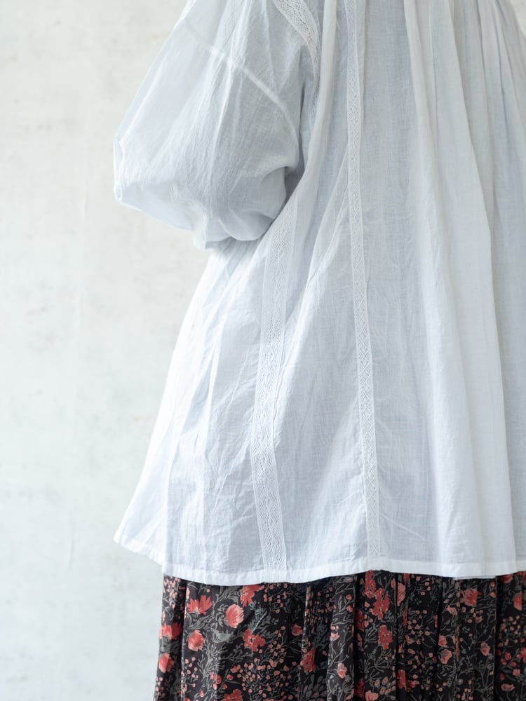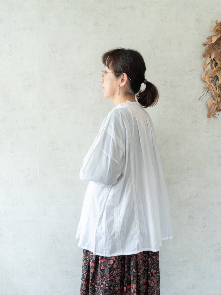 首元と、前後の身頃サイドにあしらわれたレースがさりげなく華やかさを添え、シンプルながらも上品で女性らしい印象に。襟元からふんわりと広がるギャザーが、顔まわりにやわらかさとフェミニンな印象をプラス。