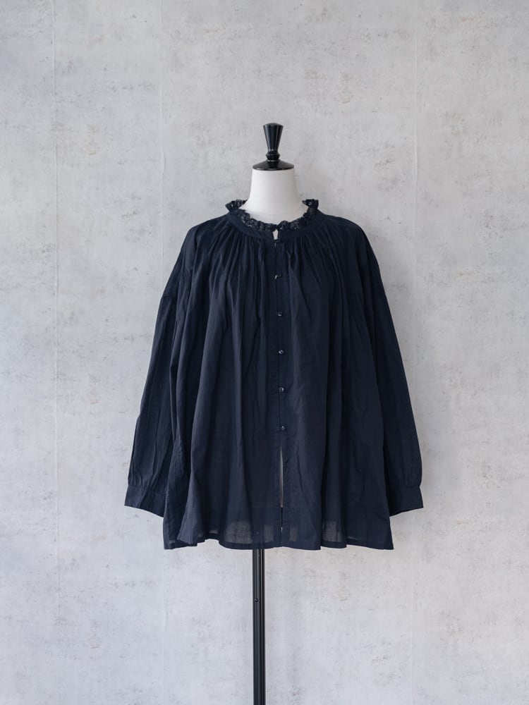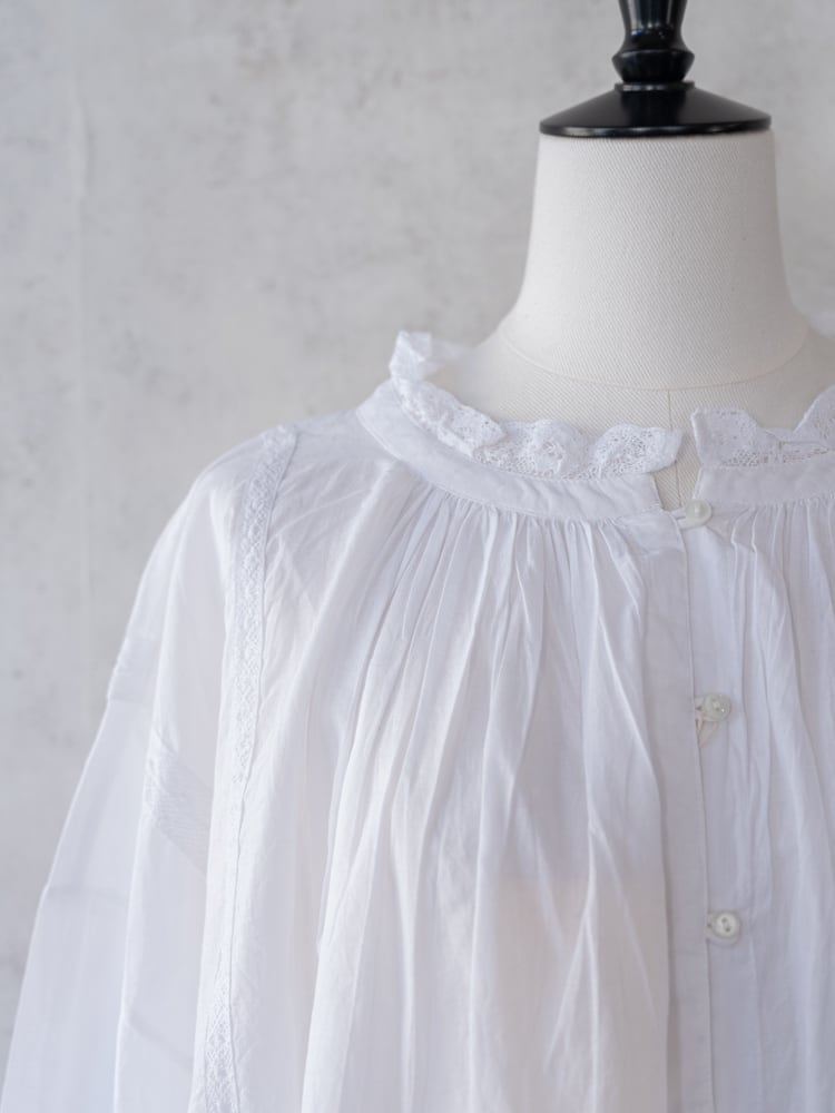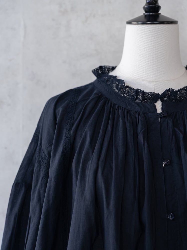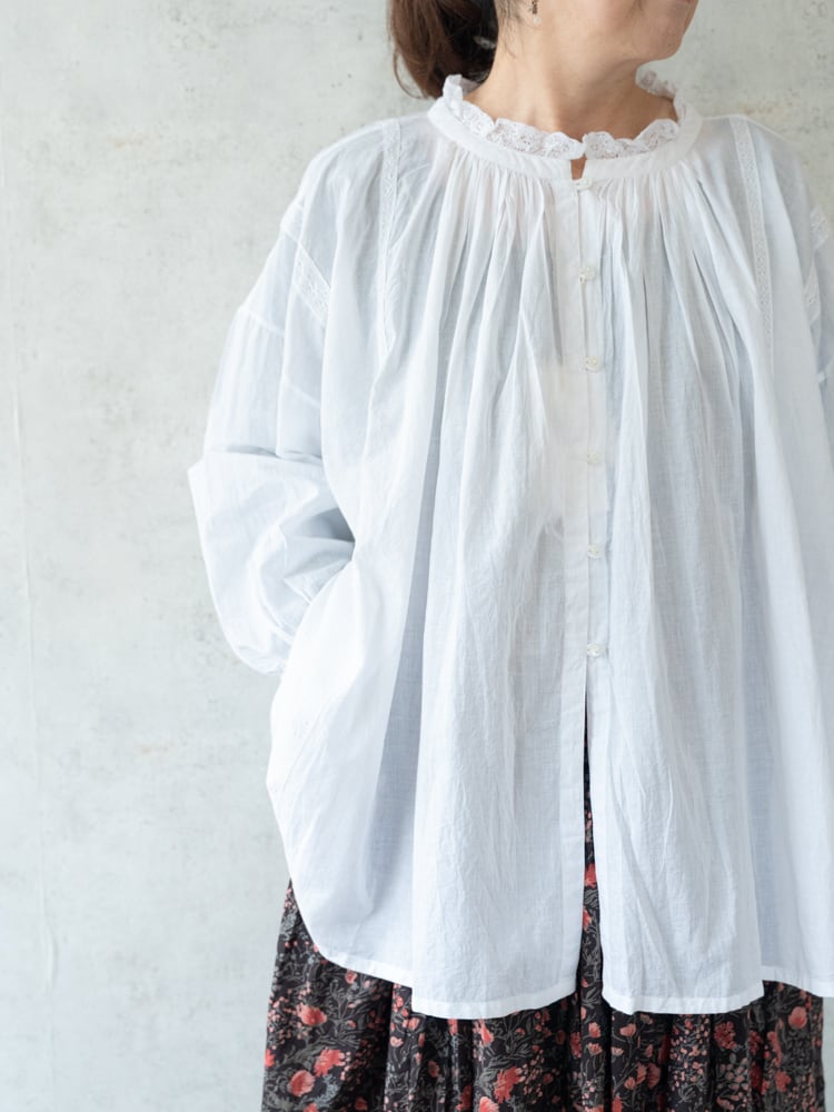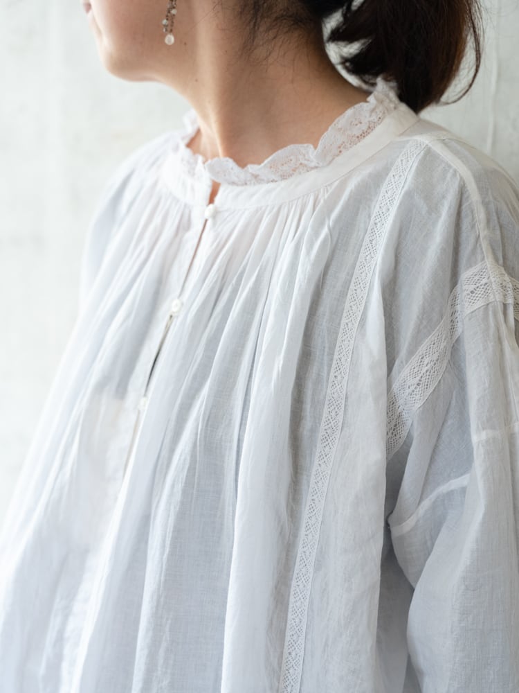 首元と、前後の身頃サイドにあしらわれたレースがさりげなく華やかさを添え、シンプルながらも上品で女性らしい印象に。襟元からふんわりと広がるギャザーが、顔まわりにやわらかさとフェミニンな印象をプラス。