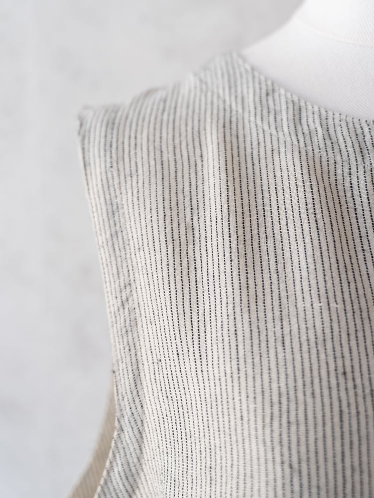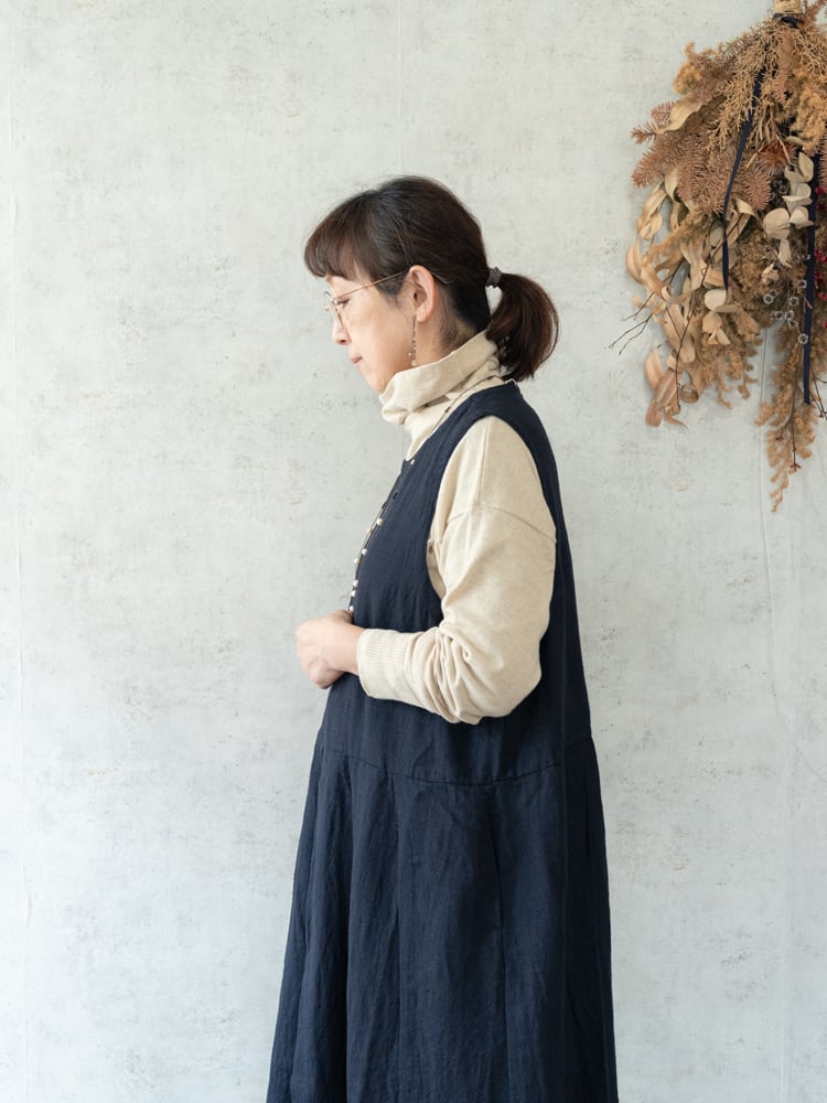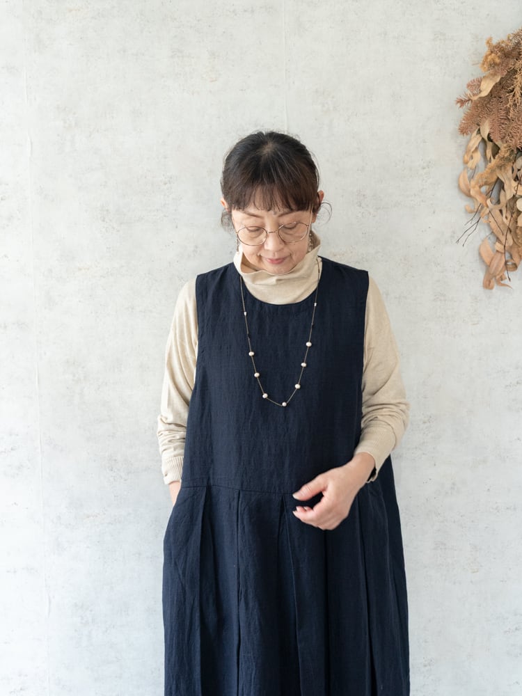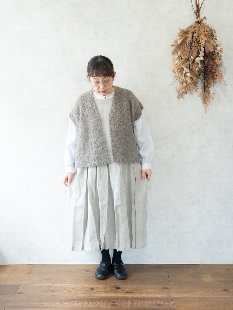 ウールの温かさとリネンのシャリ感、どちらの表情も合わせ持つ素材感が魅力のノースリーブプリーツワンピース。