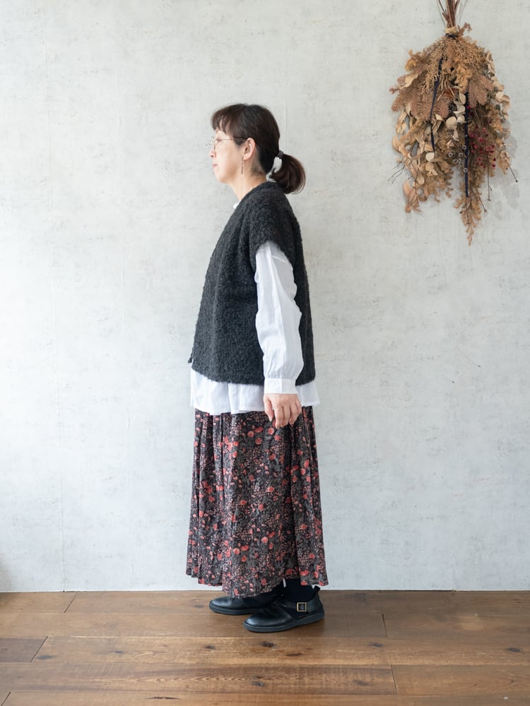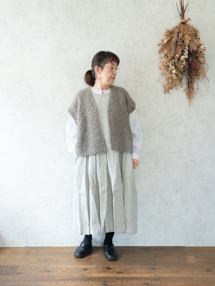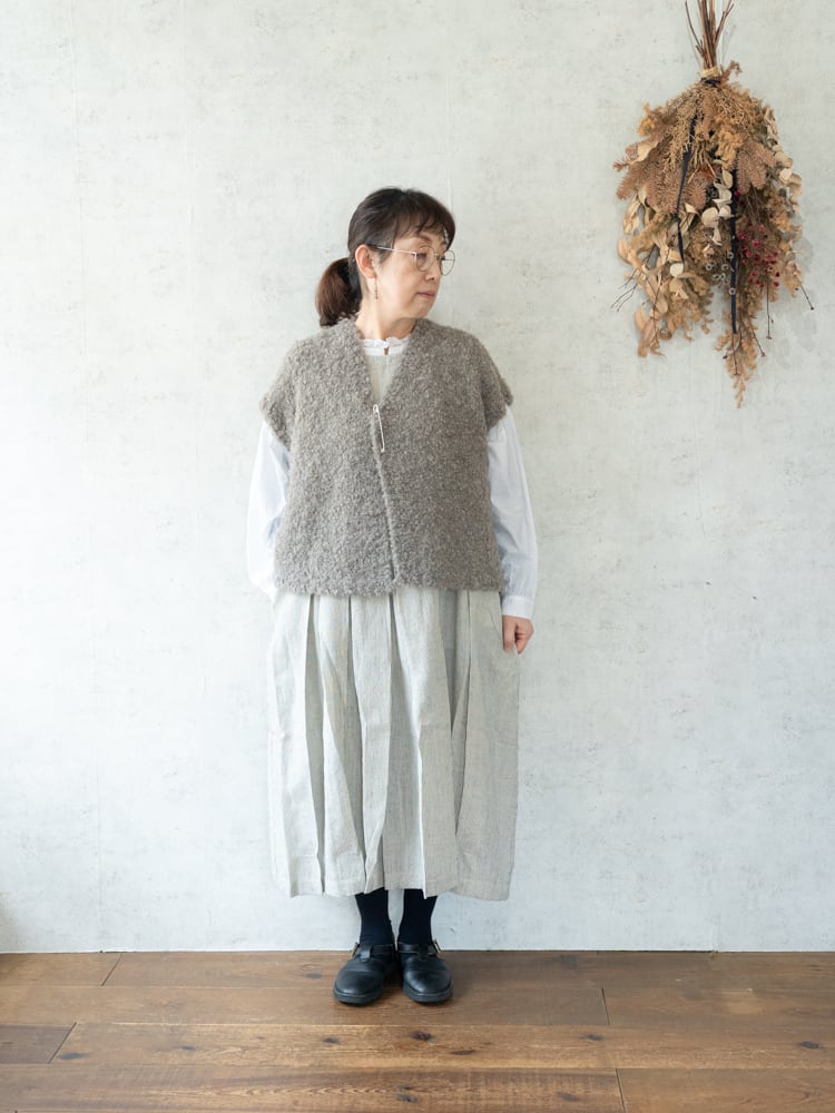 毎シーズン人気のブークレニットの新型となるショート丈Vネックベスト。付属のキルトピンで、前を留めて着用することも可能。冬場はコートの下に忍ばせて、レイヤードを楽しめる一枚です。