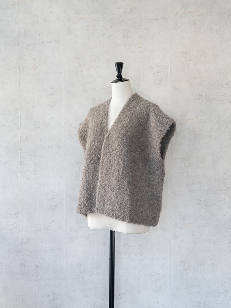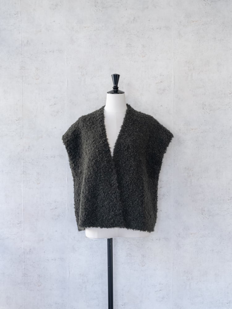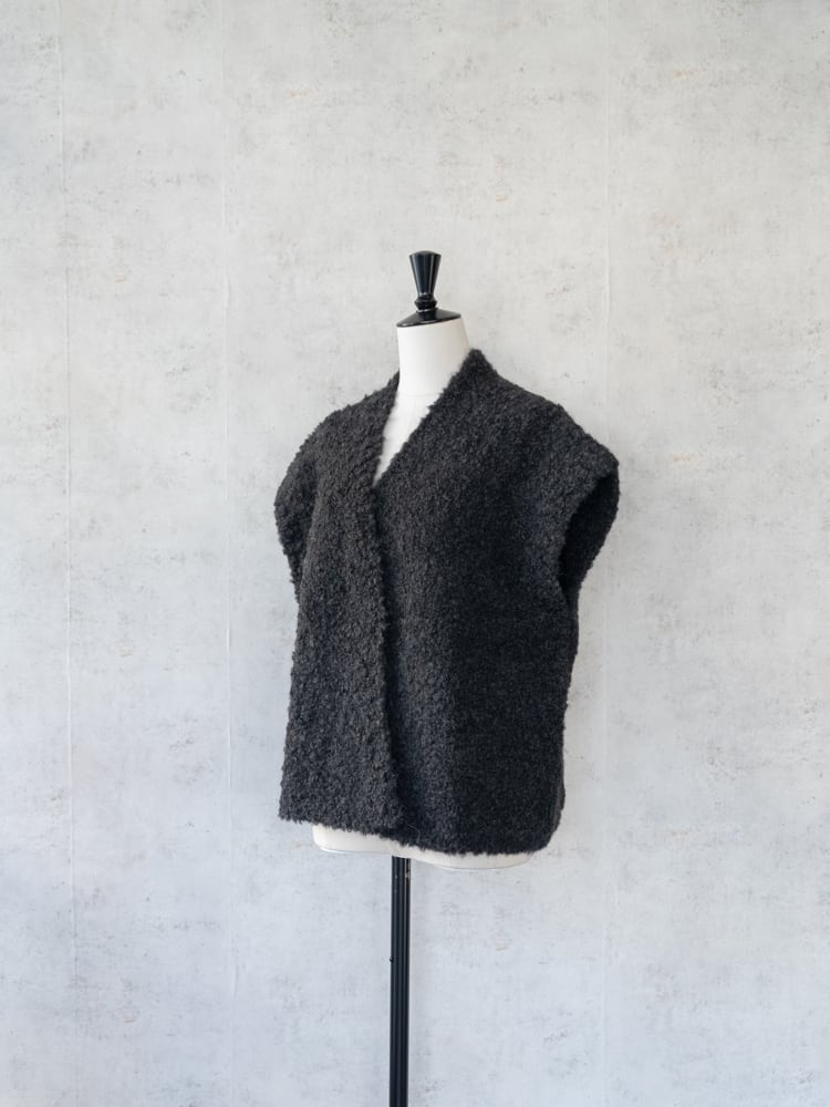 表面にループ状の糸が出るように加工されたブークレ糸で編み立てられたモコモコとした素材感が見た目にも暖かなニットベスト。