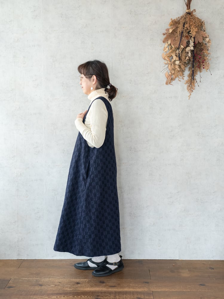 オケージョンからデイリー使いまで、幅広く活躍してくれる表情豊かなジャガード織りの生地を使用したジャンパースカート。
