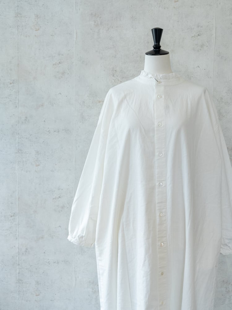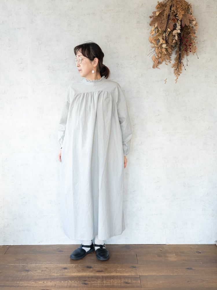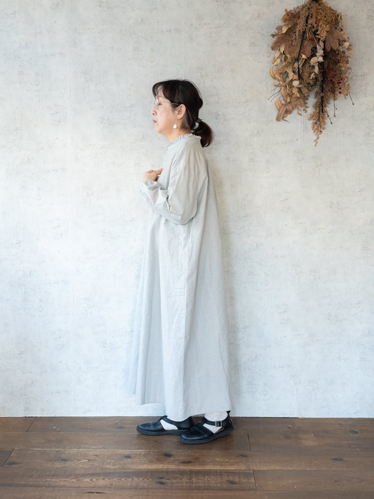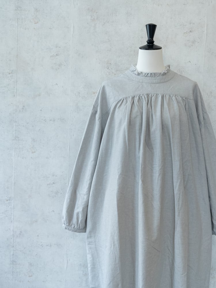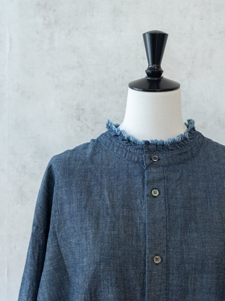 軽い素材感のコットンリネンデニムに切りっぱなしのフリル衿が可愛いアクセントになった柔らかな雰囲気のワンピース。