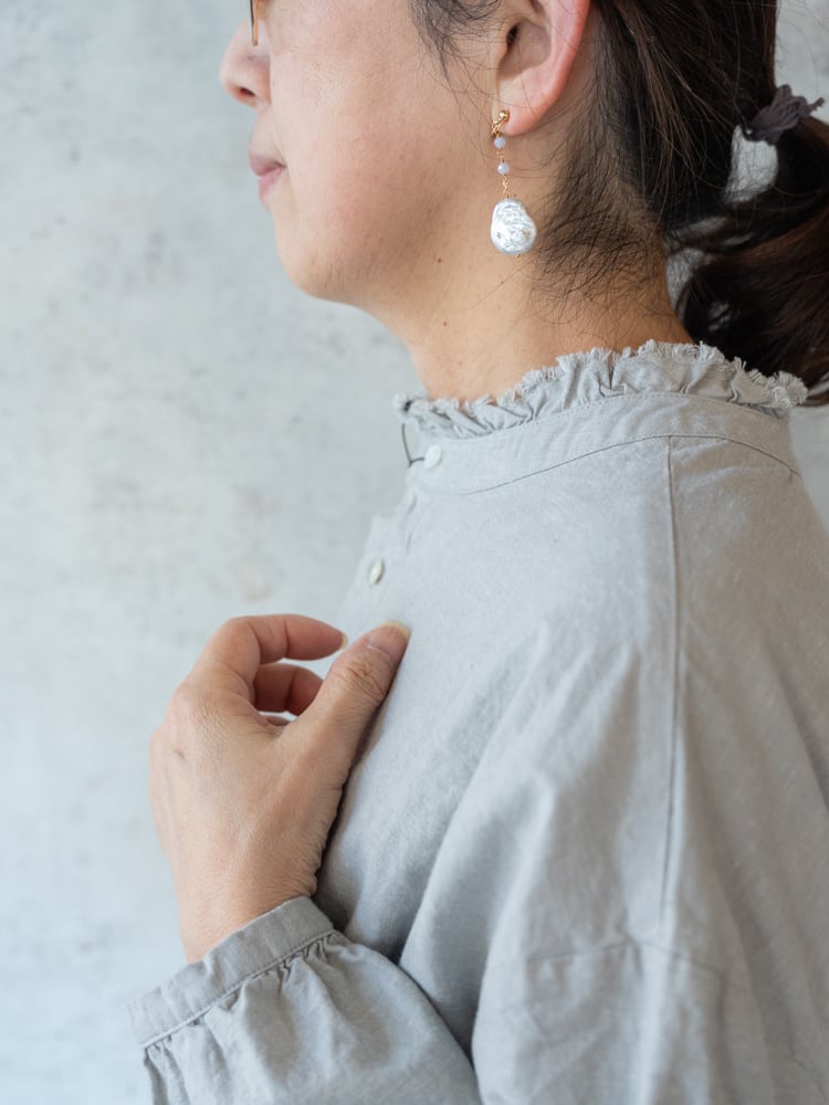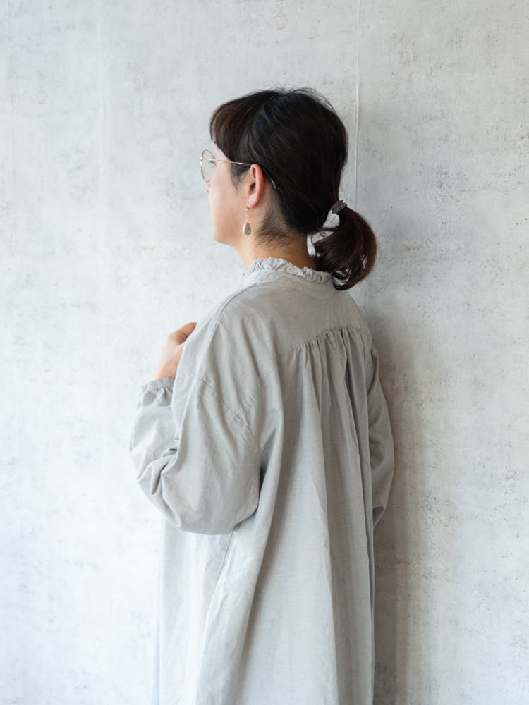 ヨーク下や袖口のギャザーのフンワリとした膨らみのあるシルエットが女性らしさを演出。