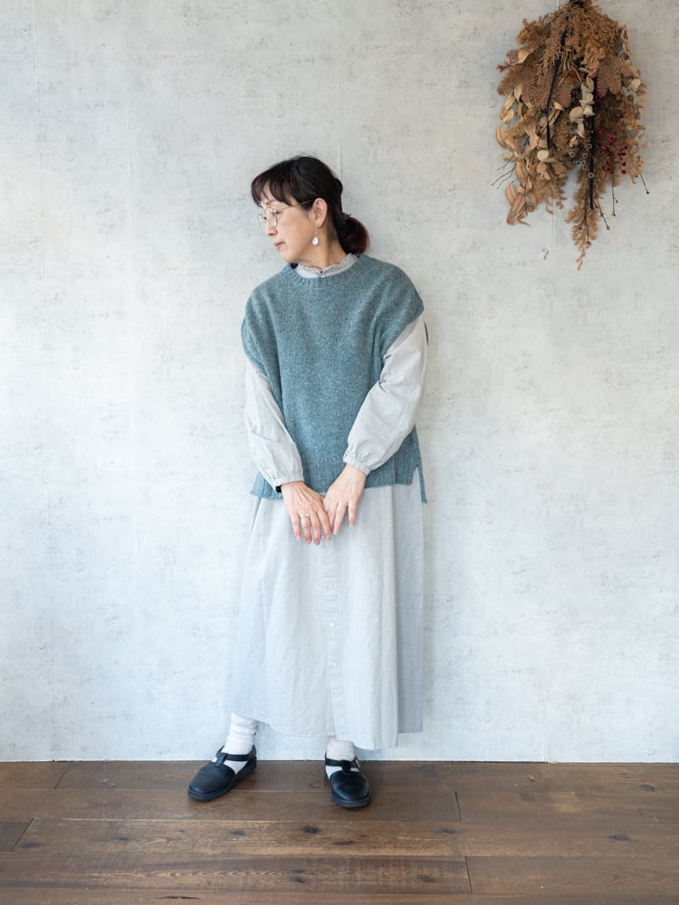 前後どちらでも着れる2way仕様で着こなしに変化がつけられ表情の違った着こなしが楽しめます、羽織としても。