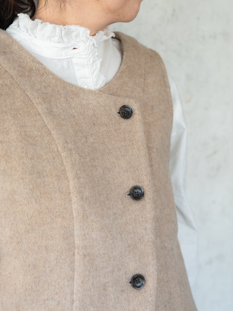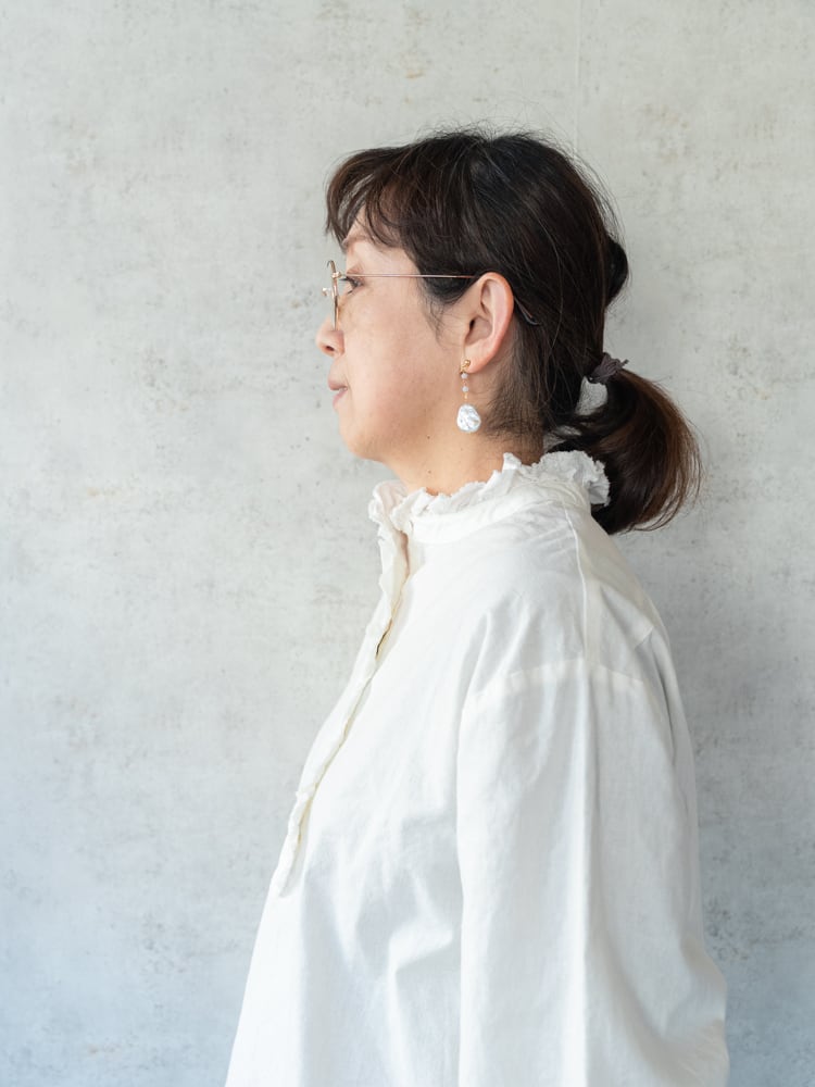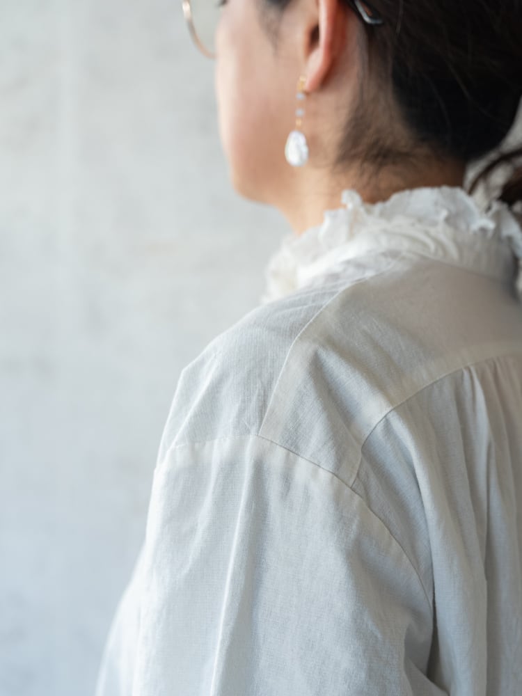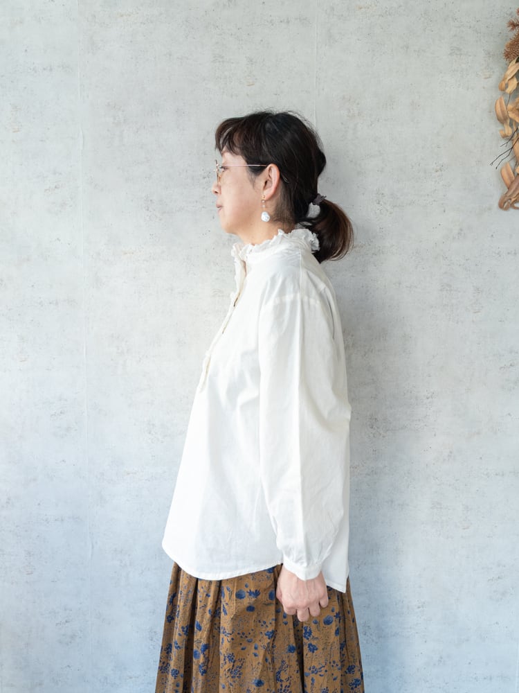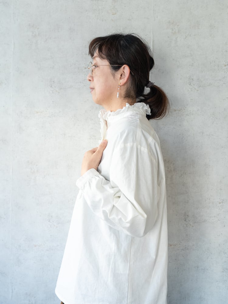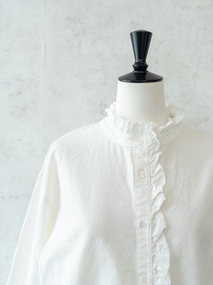 スタンドカラーから続く程よい大きさのフリルが甘過ぎず上品なアクセントに。