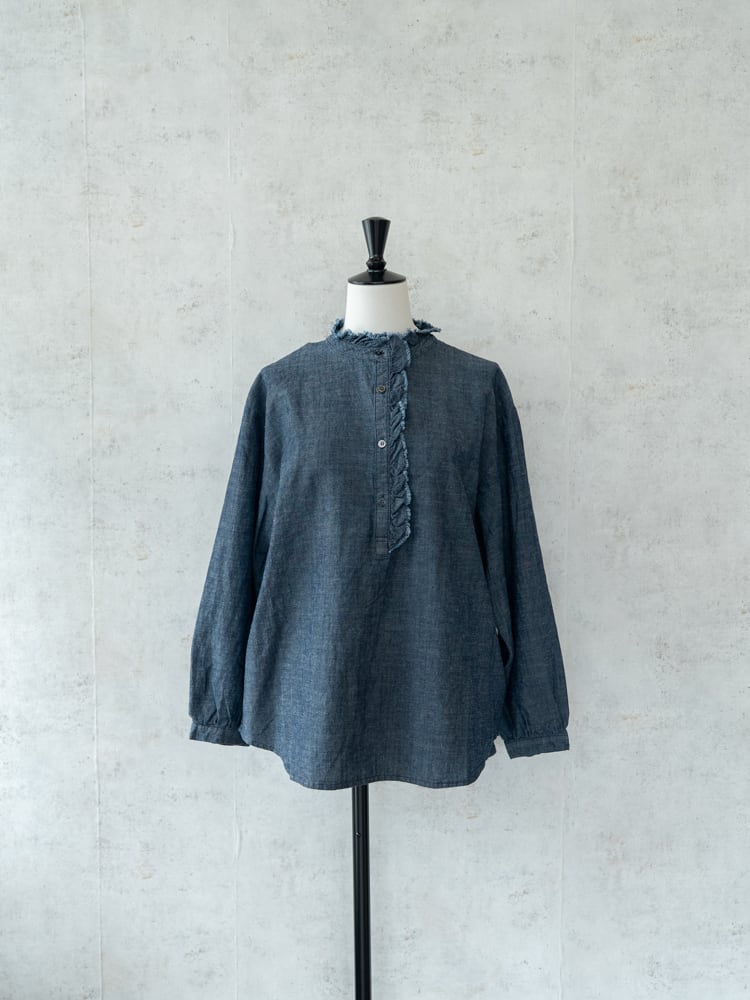 軽い素材感のコットンリネンデニムに切りっぱなしのフリル衿が可愛いアクセントになった柔らかな雰囲気のブラウス。