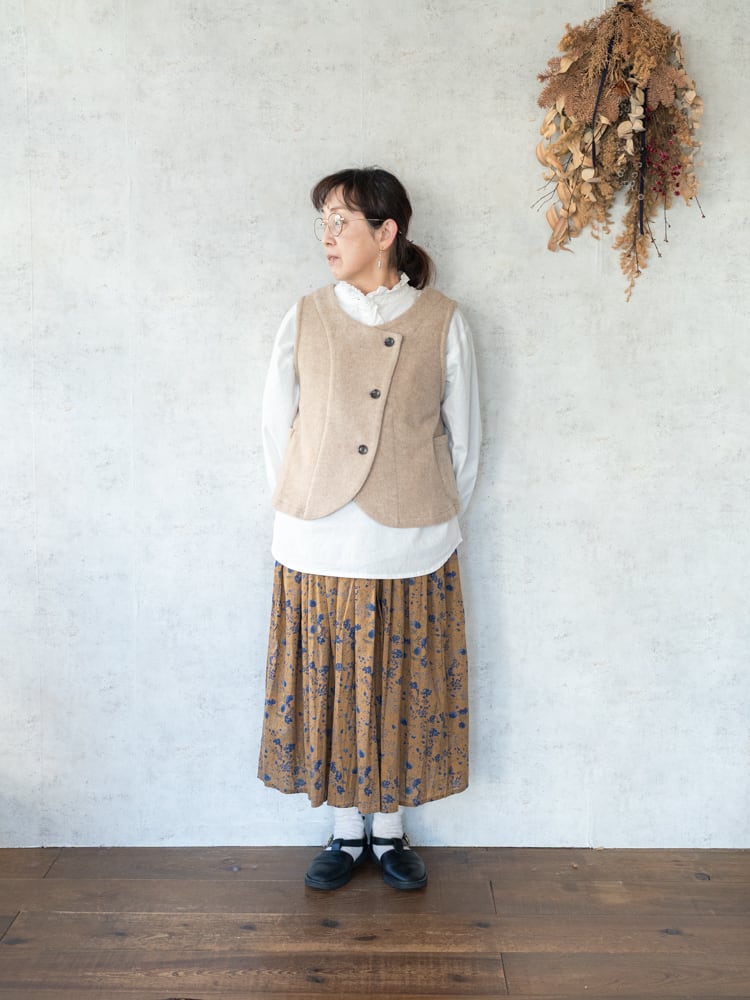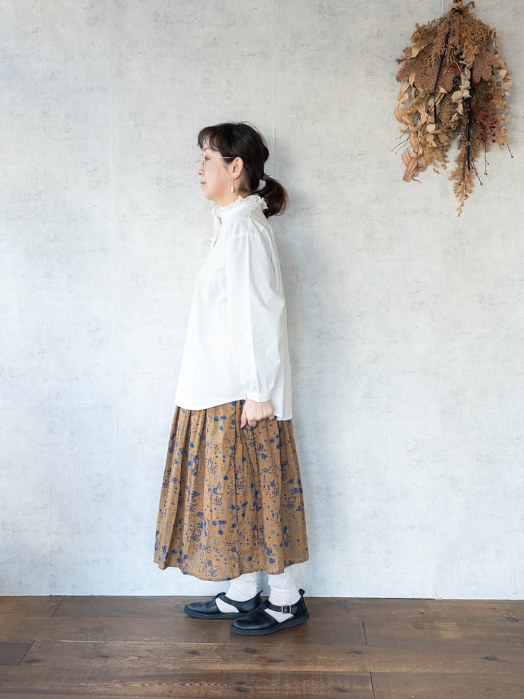袖口や背中に施されたギャザーのフンワリとしたシルエットが女性らしい雰囲気に。
