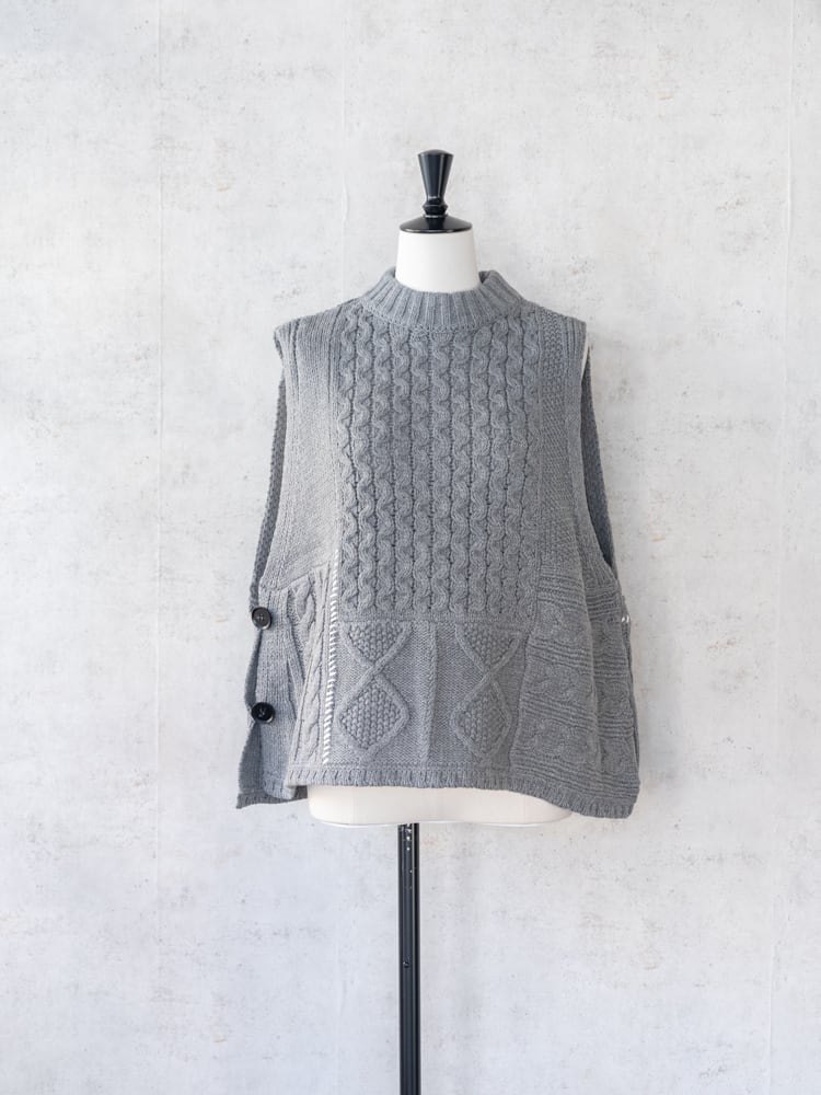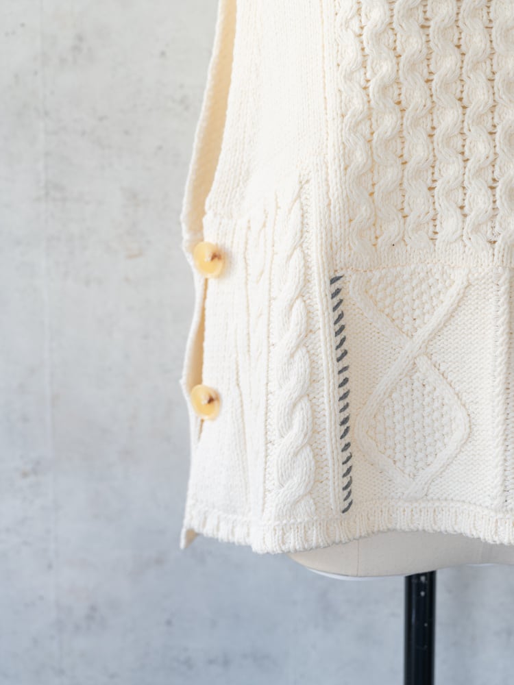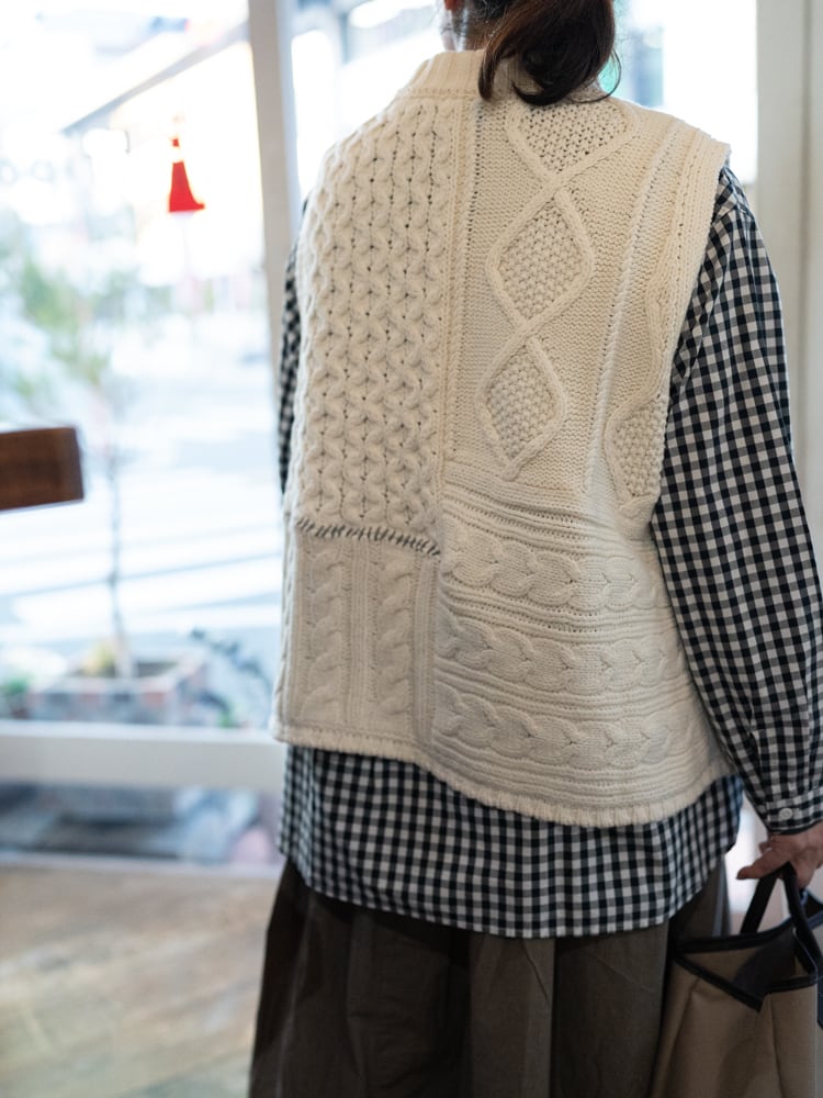 フィッシャーマンセーターで使われているアラン編みのパターンを編み合わせたプルオーバーベスト。