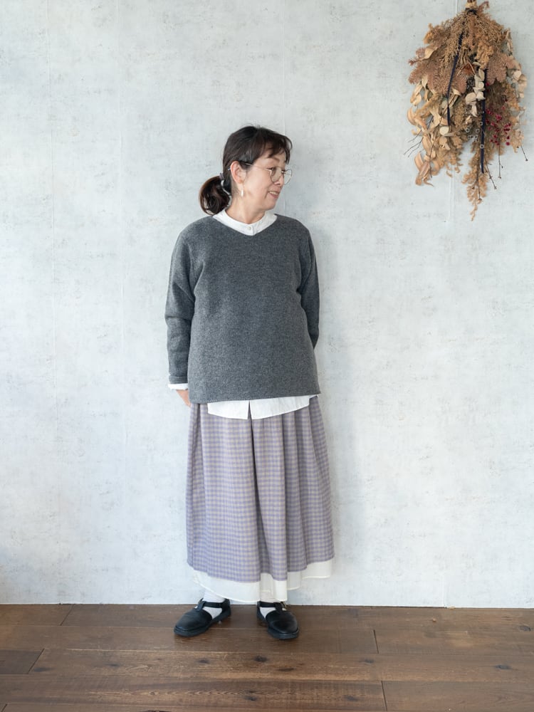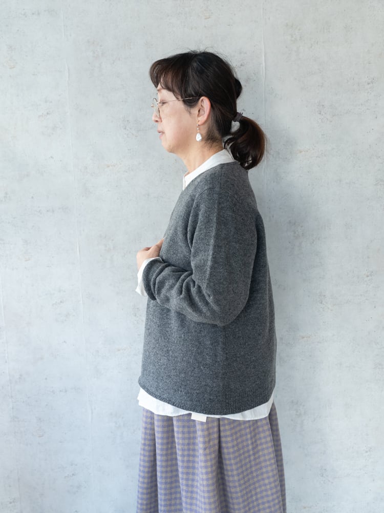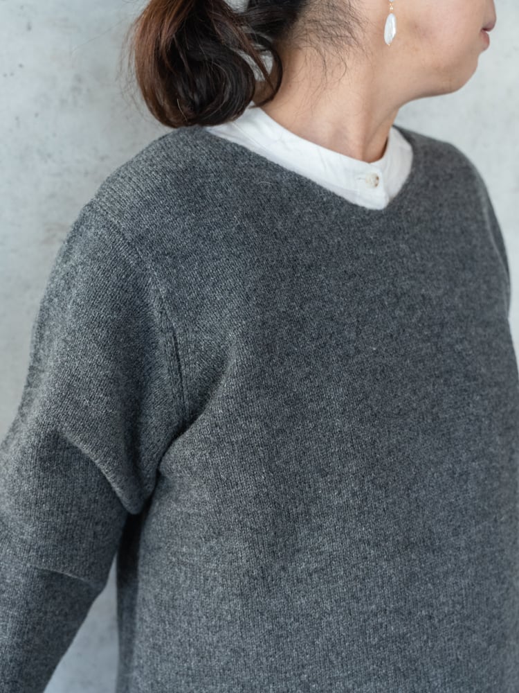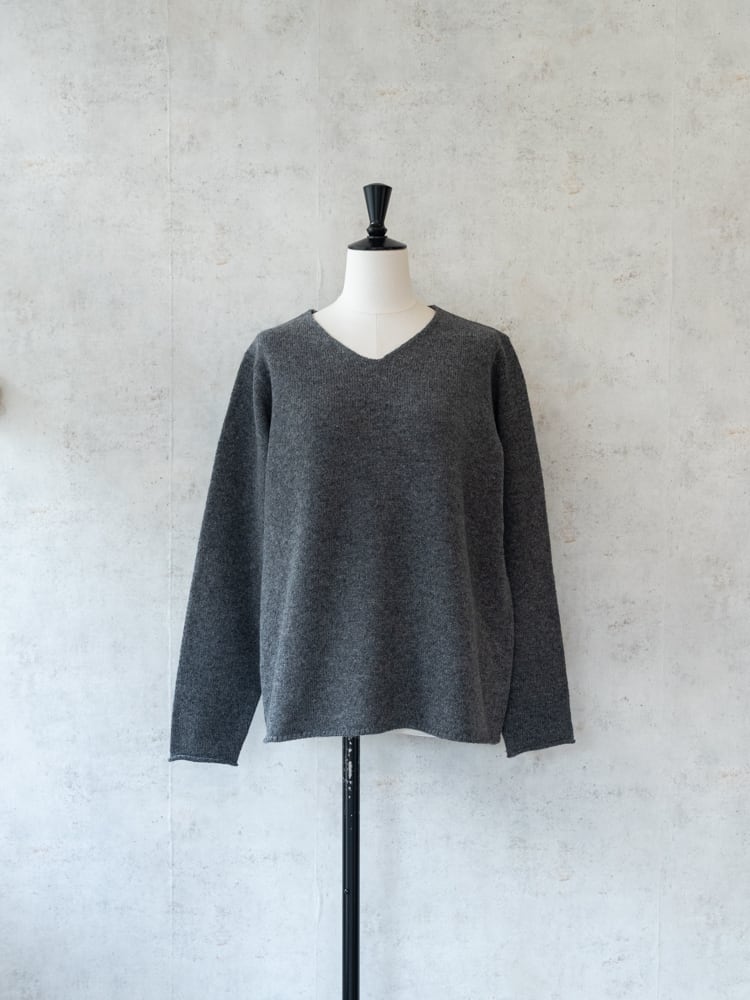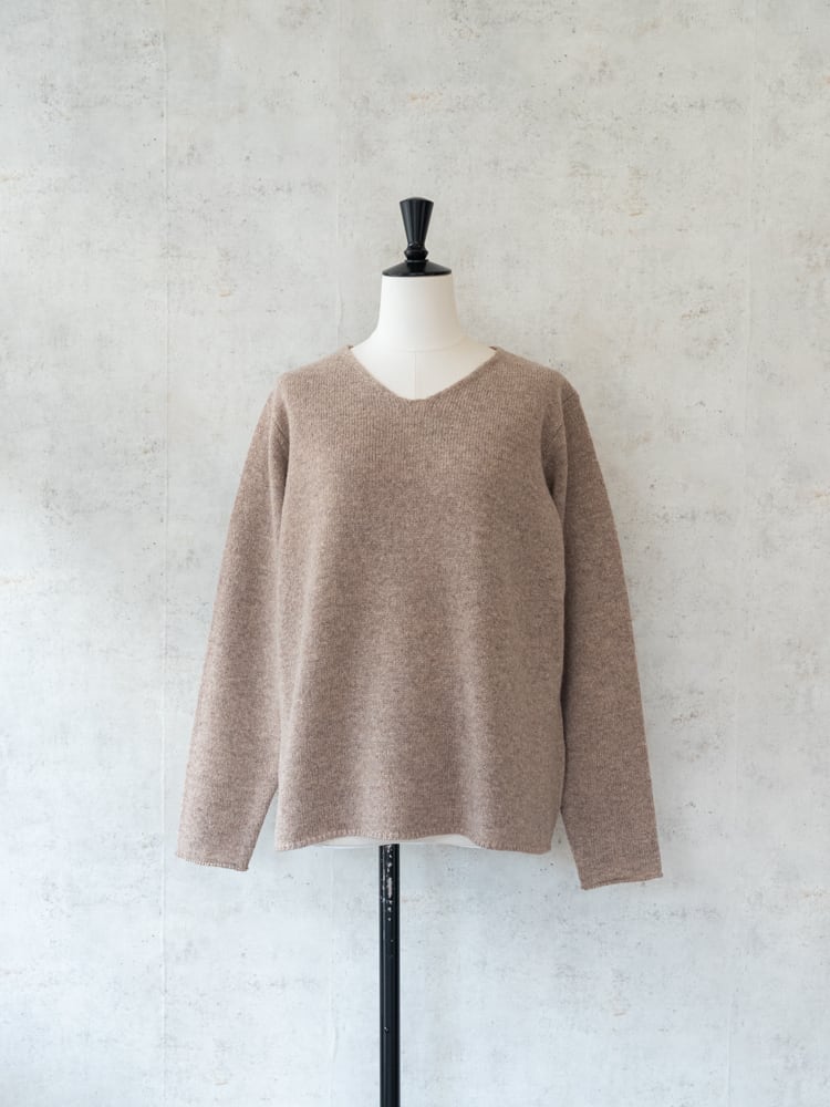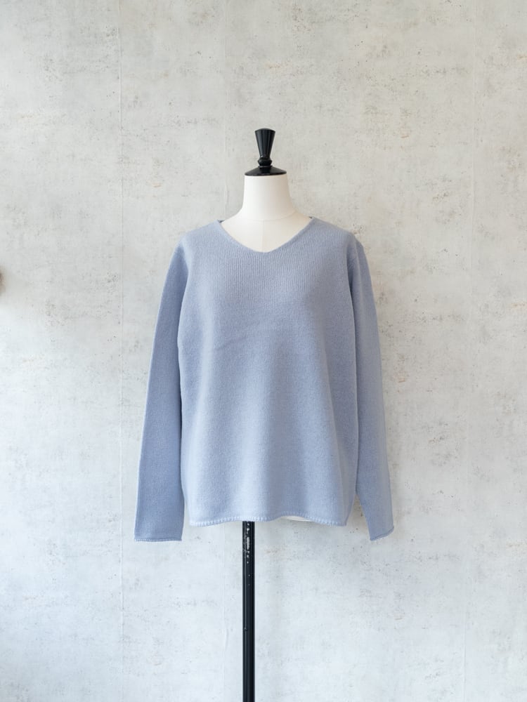スッキリとシンプルな浅めのVネックのプルオーバーニット、袖や裾はリブではなくロール仕様でナチュラルな雰囲気の一枚です。