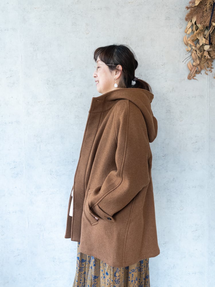 腰回りが隠れるくらいの着丈のショートコートは、落ち感のある綺麗なAラインシルエットで、ボリュームのあるフードが目を惹きます。