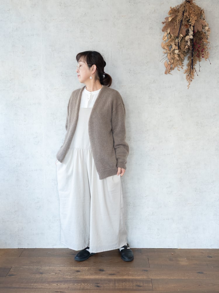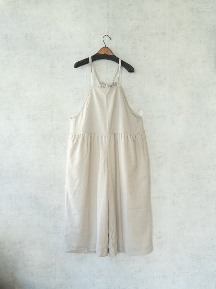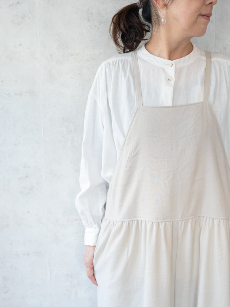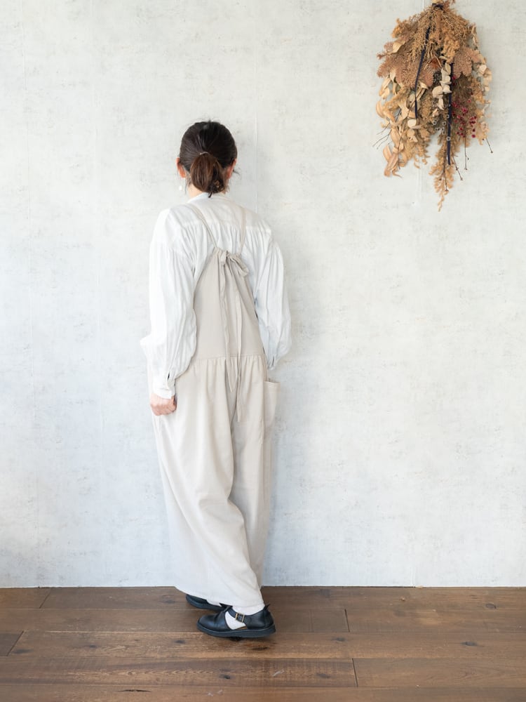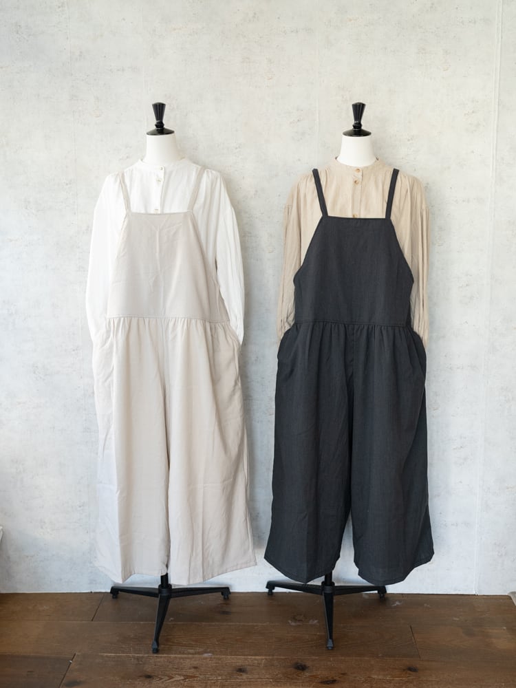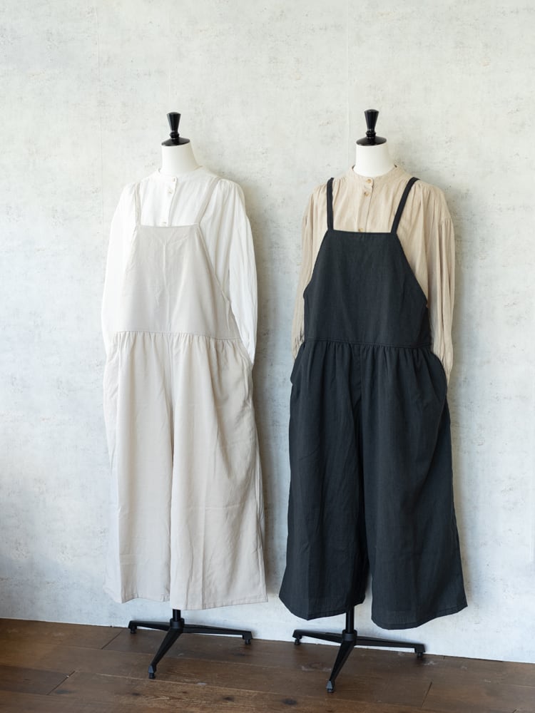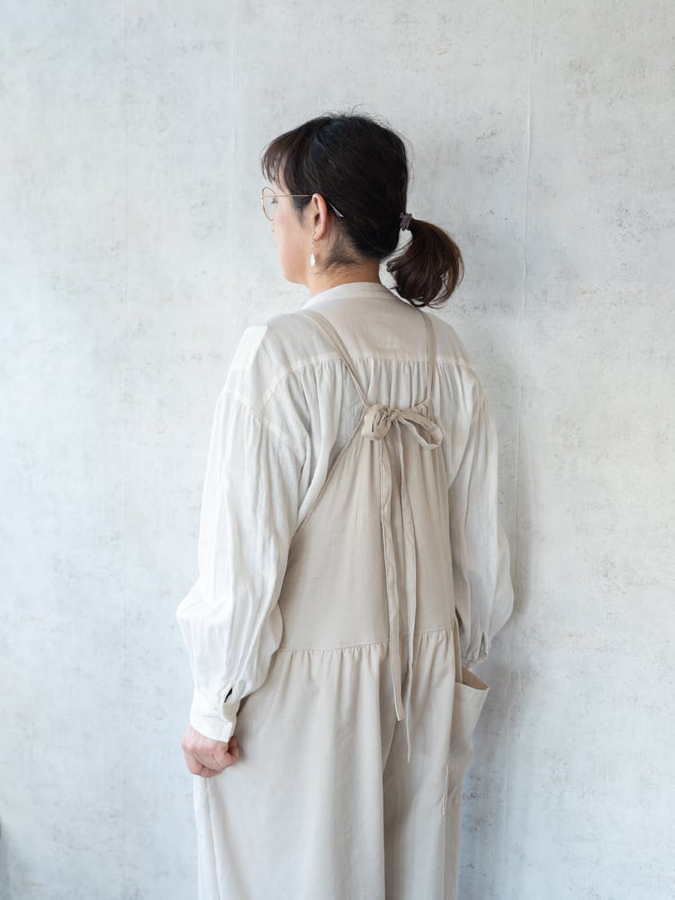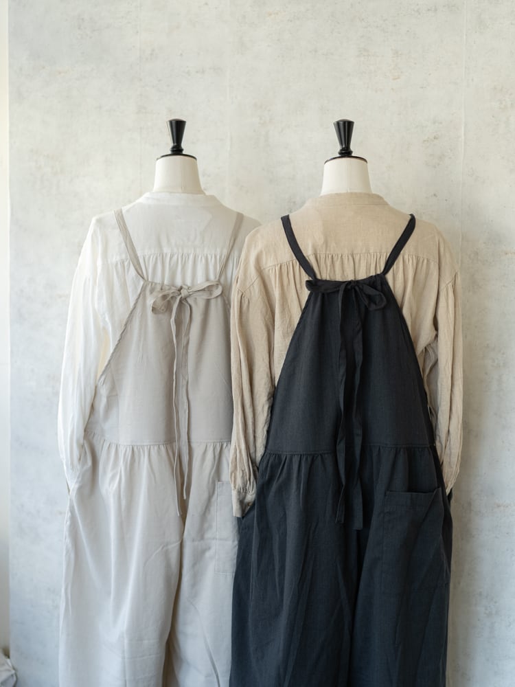 後ろ姿まで印象的で雰囲気のあるGauze#のトラヴァイユサロペット、今シーズンウールシルクリネン素材で登場です。