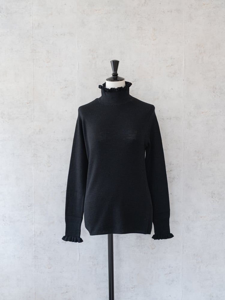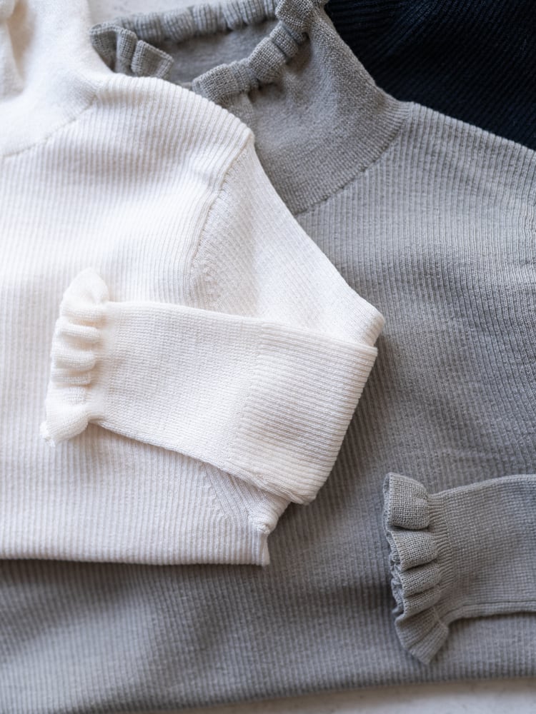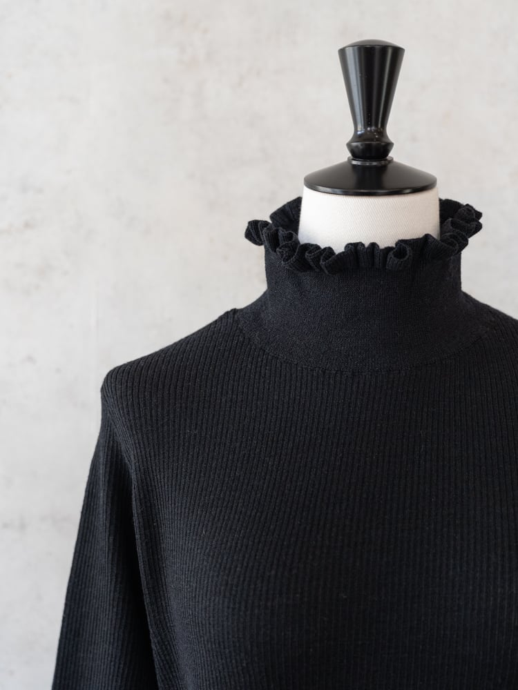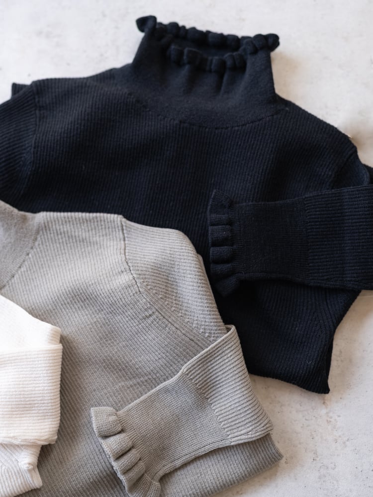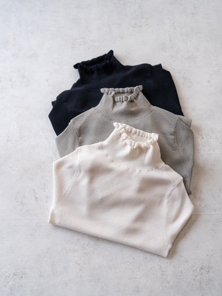 定評のあるベーシックなフリルハイネックセーターに新色を加えて再入荷しました。