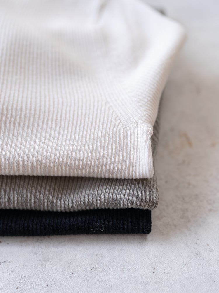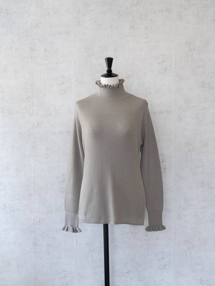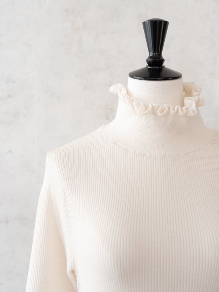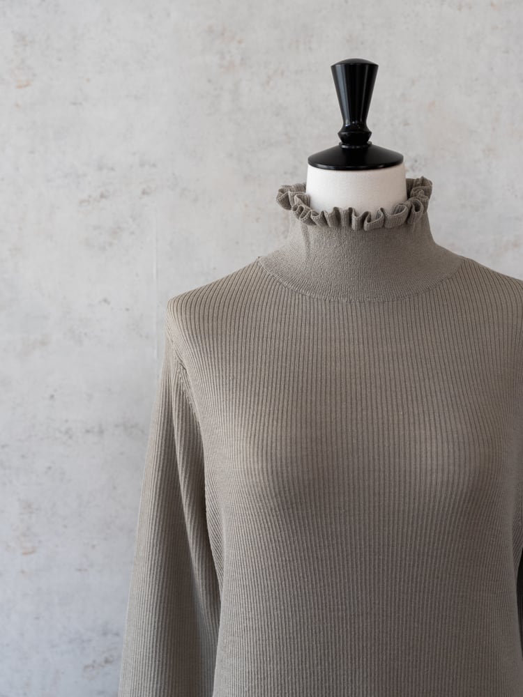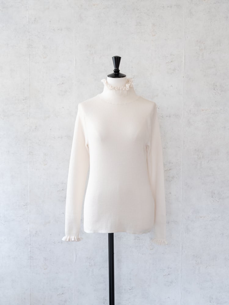 定評のあるベーシックなフリルハイネックセーターに新色を加えて再入荷しました。